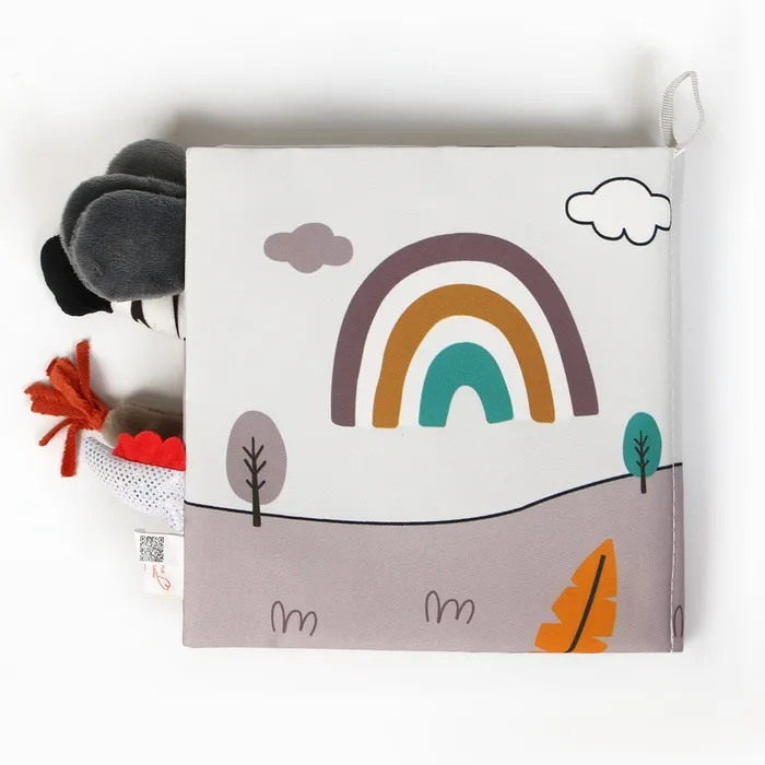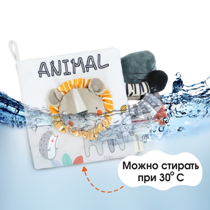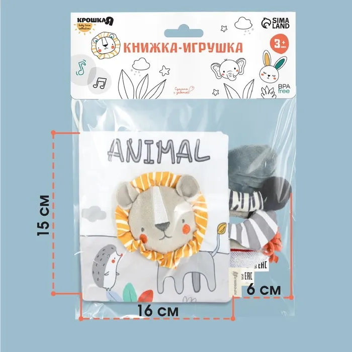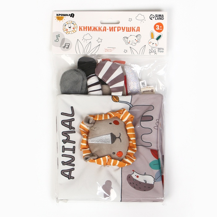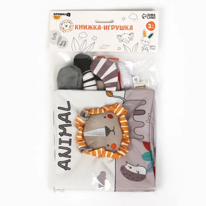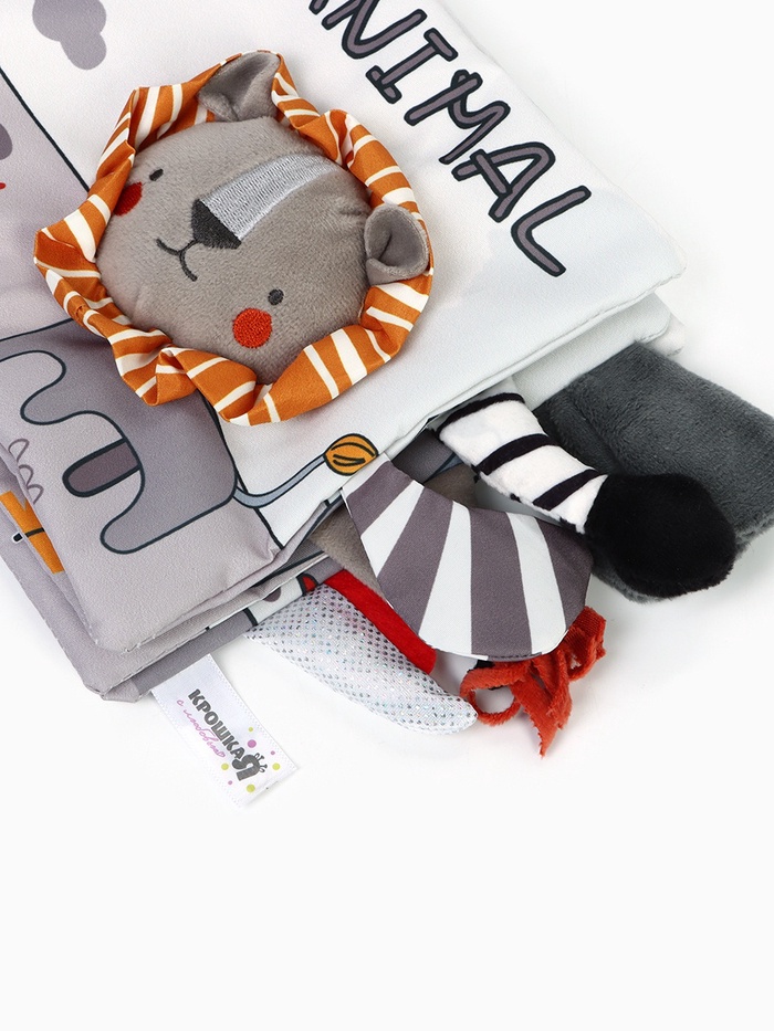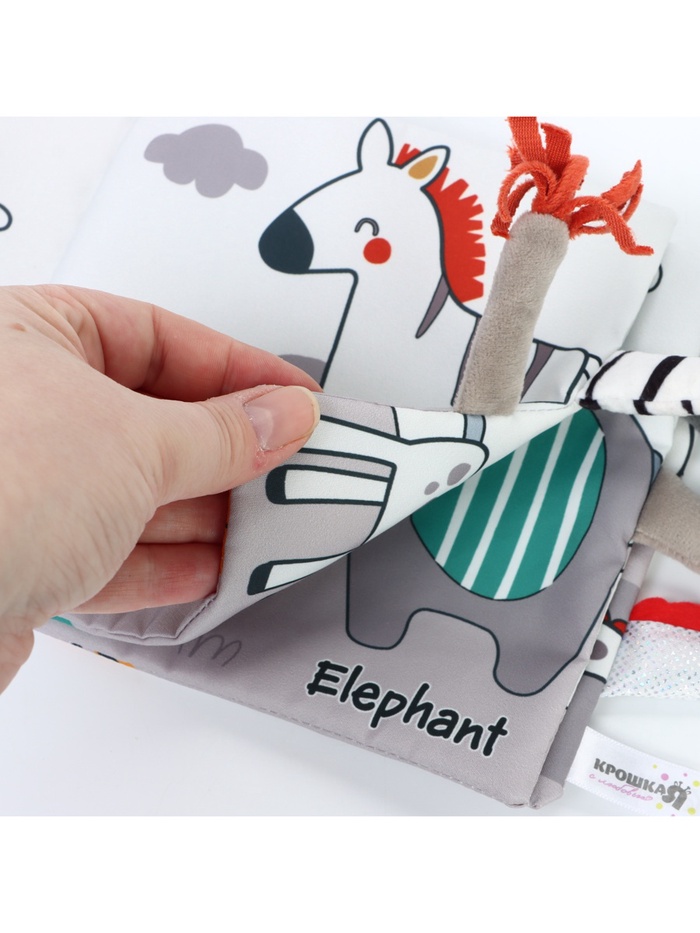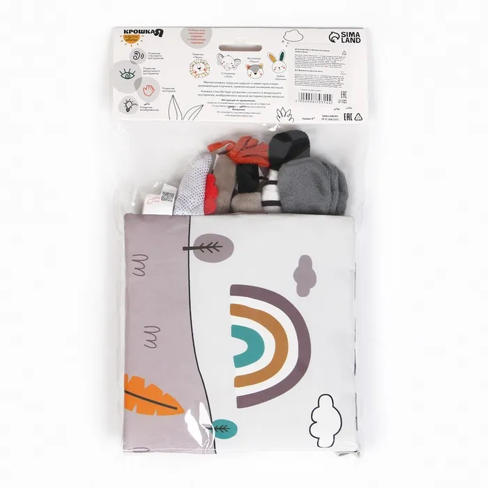 - Книжка выполнена из мягкого текстиля с шуршащими элементами для тактильного и звукового развлечения.