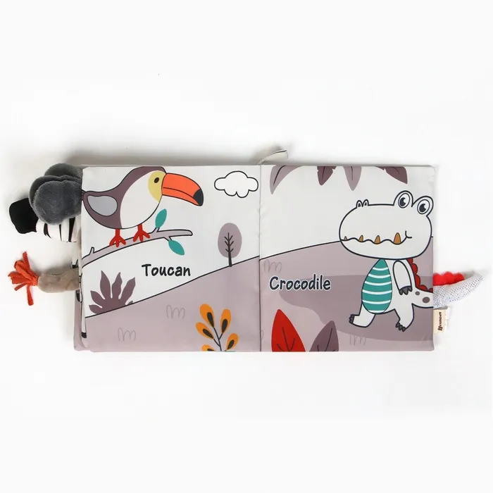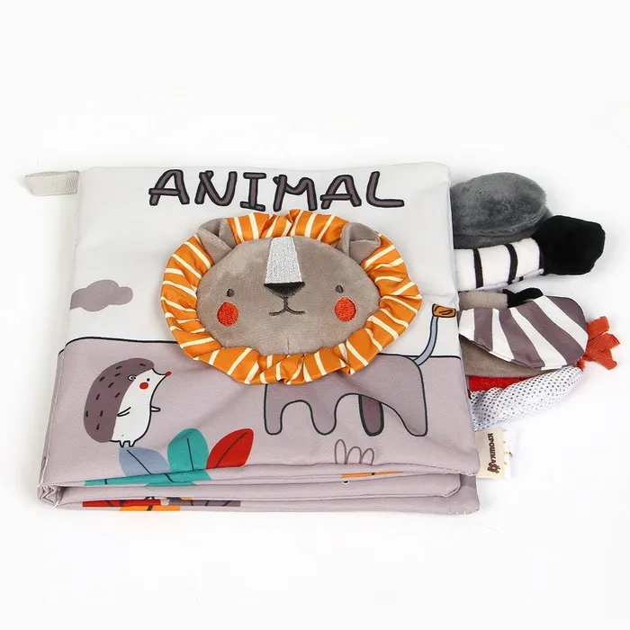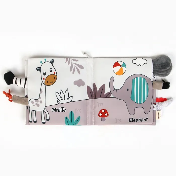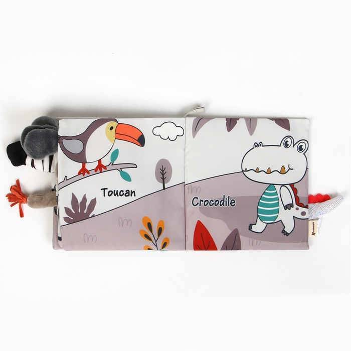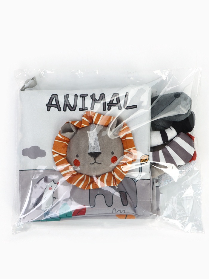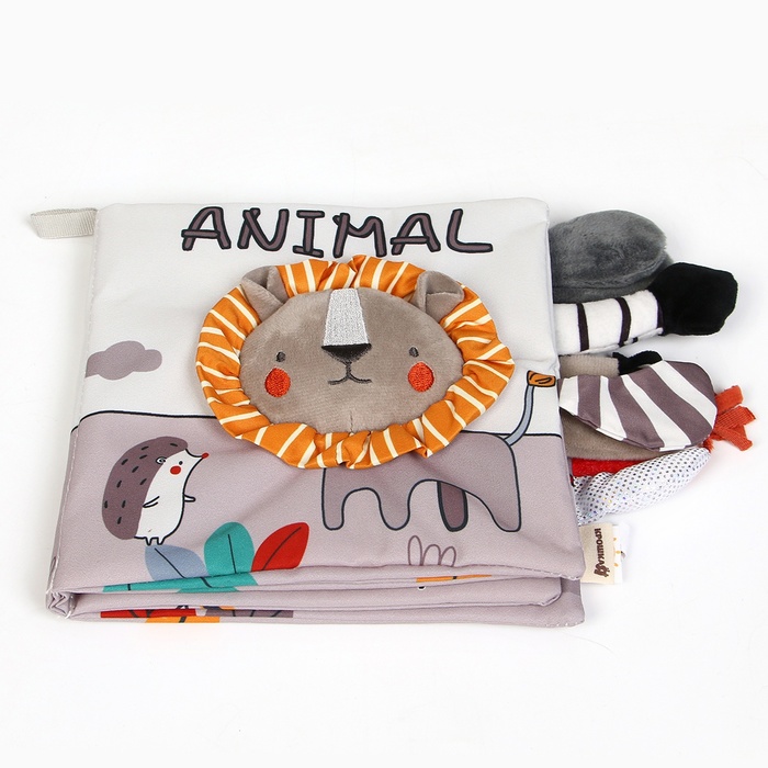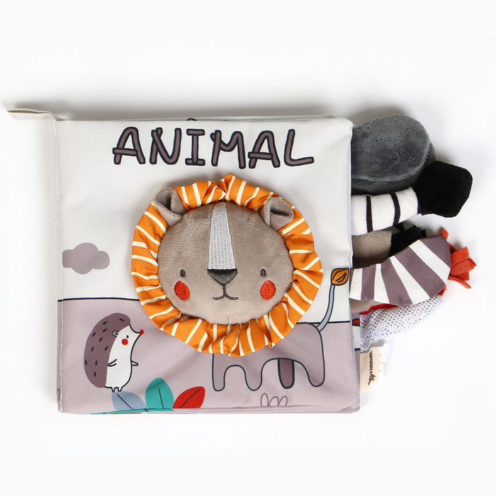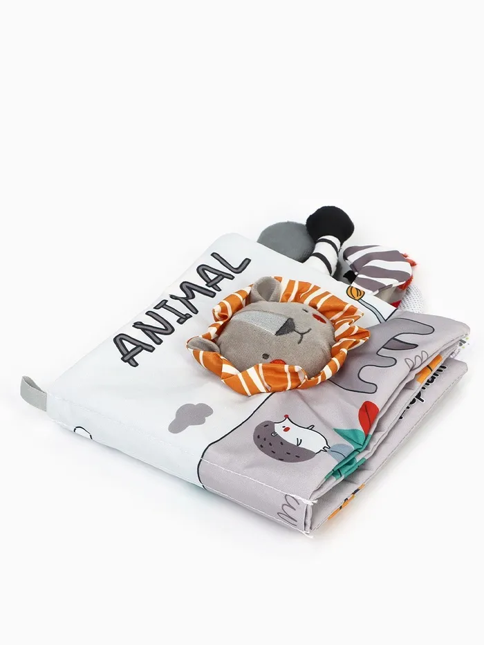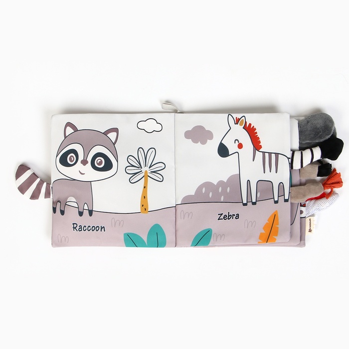 - Книжка выполнена из мягкого текстиля с шуршащими элементами для тактильного и звукового развлечения.