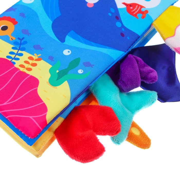 - В книжке есть хвостики и лапки разных морских обитателей. Малышу будет интересно их трогать и угадывать, кому они принадлежат.