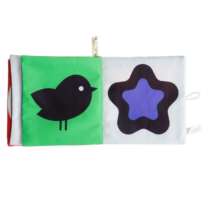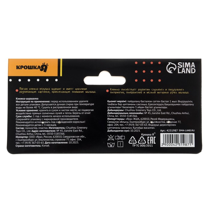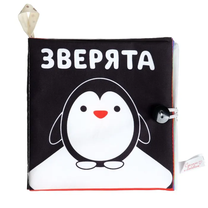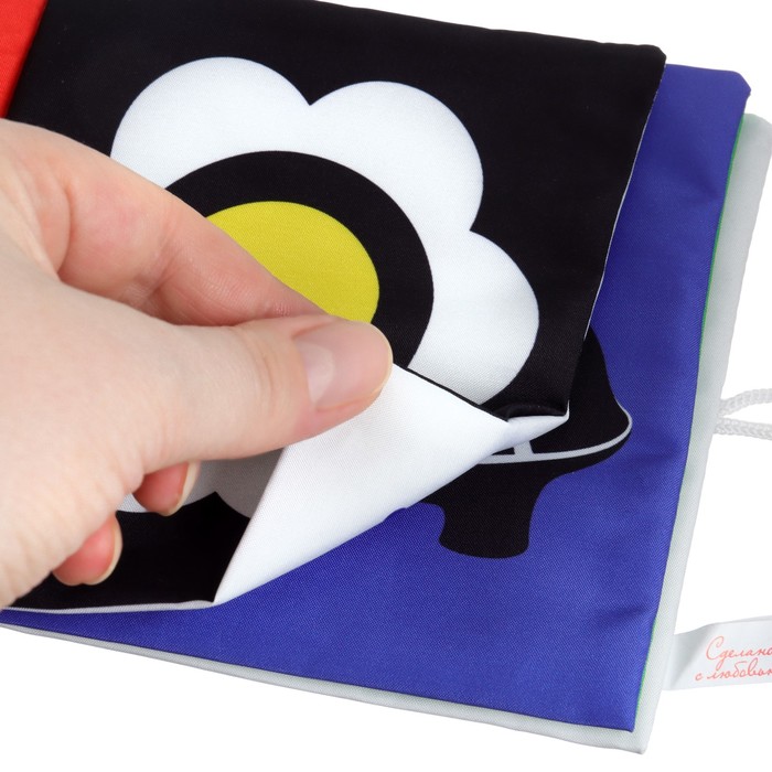 - Книжка выполнена из мягкого текстиля с шуршащими элементами для тактильного и звукового развлечения.