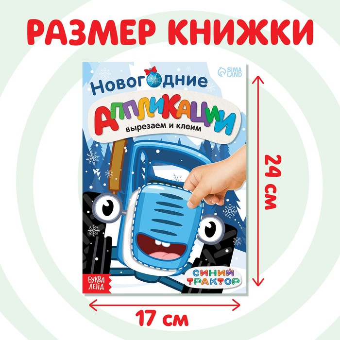 Внутри книги 4 весёлые аппликации с забавными героями «Синего Трактора». Соберите картинки вместе и создайте волшебную атмосферу Нового года!