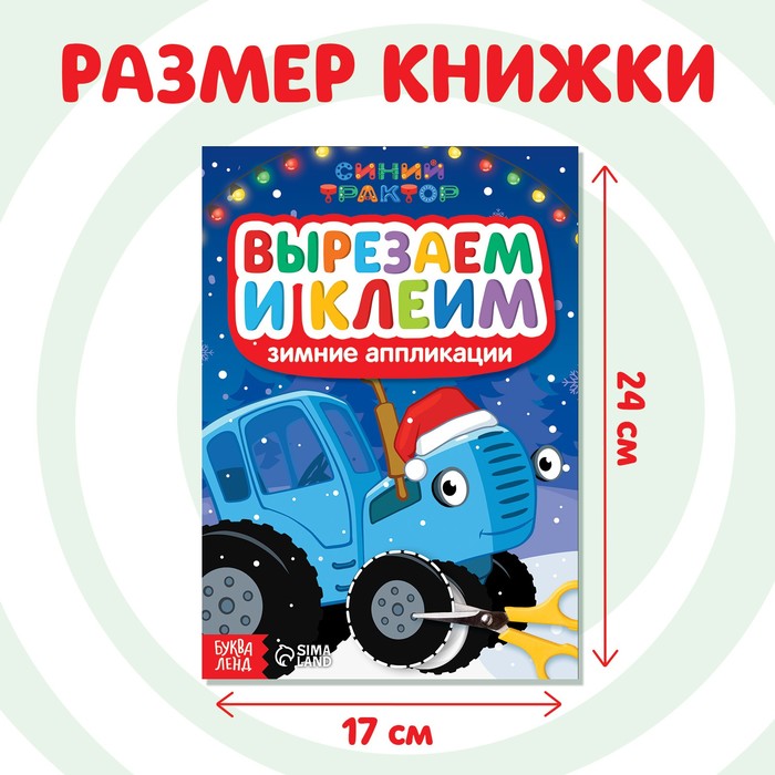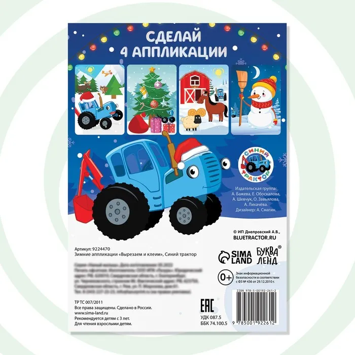 Внутри книги 4 весёлые аппликации с забавными героями «Синего Трактора». Соберите картинки вместе и создайте волшебную атмосферу Нового года!