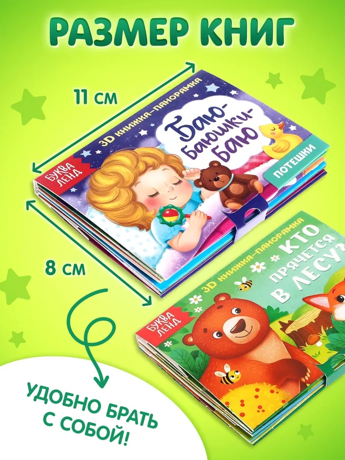 Набор из двух книжек-панорамок с 3D-эффектом — это увлекательное путешествие в мир сказок и колыбельных для детей от 3 лет. Каждая из 12-страничных книг раскрывается, как волшебный портал, оживляя любимые истории с помощью объёмных иллюстраций. Такой набор станет отличным подарком, который поможет ребёнку полюбить чтение и развить воображение.