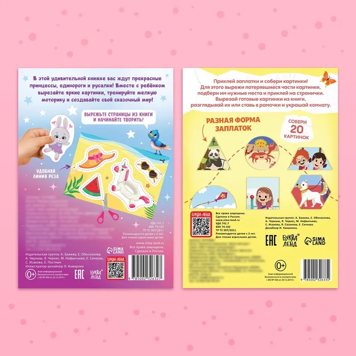 - Книга станет хорошей основой для совместного времяпрепровождения с ребёнком. Вы можете вырезать картинки вместе, обсуждать детали и цвета, а затем создать из них целую коллекцию оригинальных аппликаций. Это не только полезно, но и весело!