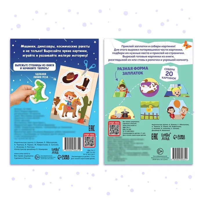 - Книга станет хорошей основой для совместного времяпрепровождения с ребёнком. Вы можете вырезать картинки вместе, обсуждать детали и цвета, а затем создать из них целую коллекцию оригинальных аппликаций. Это не только полезно, но и весело!