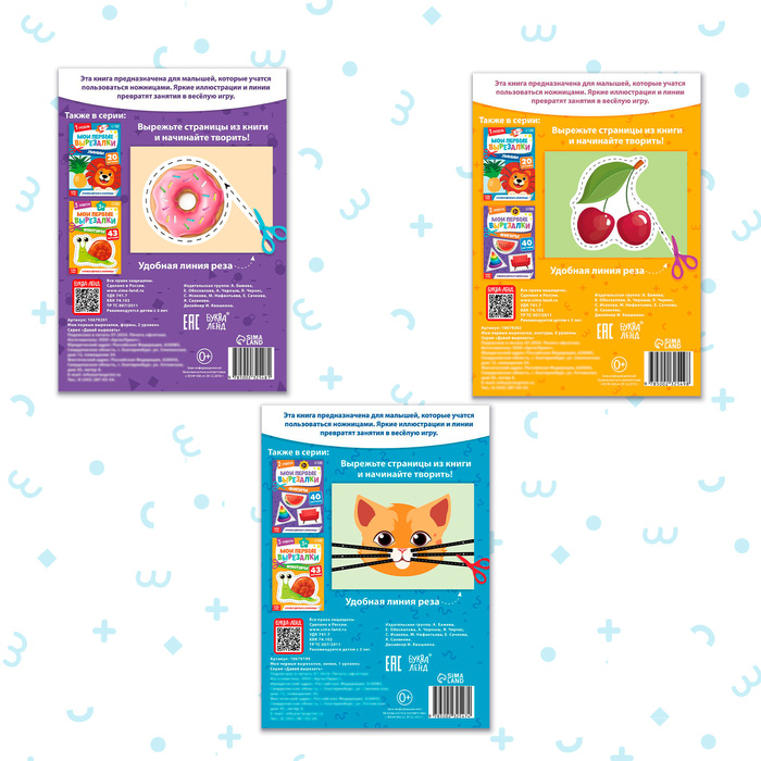 Набор книжек-вырезалок «Мои первые вырезалки» станет отличным выбором для детей от 3 лет, которые начинают осваивать работу с ножницами. Три книжки формата А5 с 103 картинками помогут малышу научиться вырезать по линиям и контурам, развивая мелкую моторику и творческие способности.