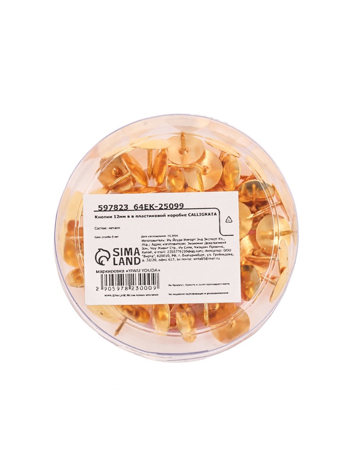 Кнопки канцелярские 12 мм., в картонной коробке, 50 штук, золотистые — Характеристики