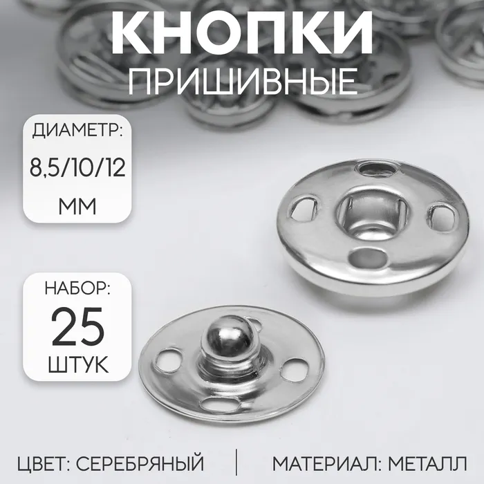 В наборе 25 штук, d = 8,5/10/12 мм, цвет серебряный.