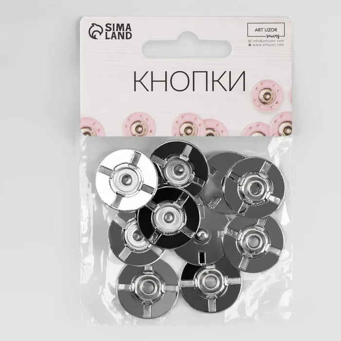 В наборе пять кнопок, d = 21 мм, цвет серебряный.