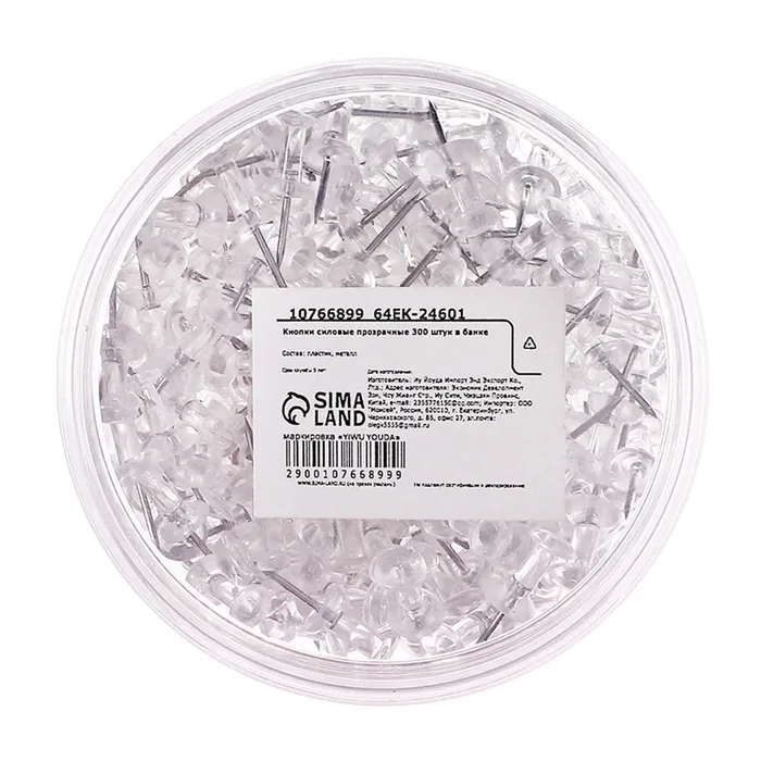 Представляем вашему вниманию прозрачные силовые кнопки в стильной пластиковой банке — идеальное решение для упорядочивания и оформления документов. Компактная упаковка рассчитана на 300 штук, что гарантирует долгосрочную поддержку в ваших офисных и домашних проектах. Прозрачность кнопок незаметно, но уверенно удерживает ваши бумаги, при этом сохраняя их презентабельный вид.