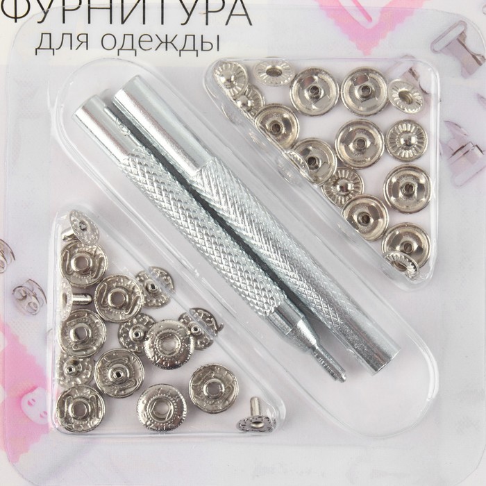 В наборе: 8 кнопок, d = 10 мм, цвет серебряный; установщик.