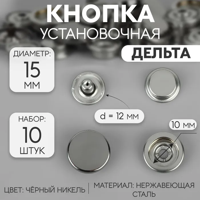 В наборе 10 кнопок, d = 15 мм, цвет чёрный никель.