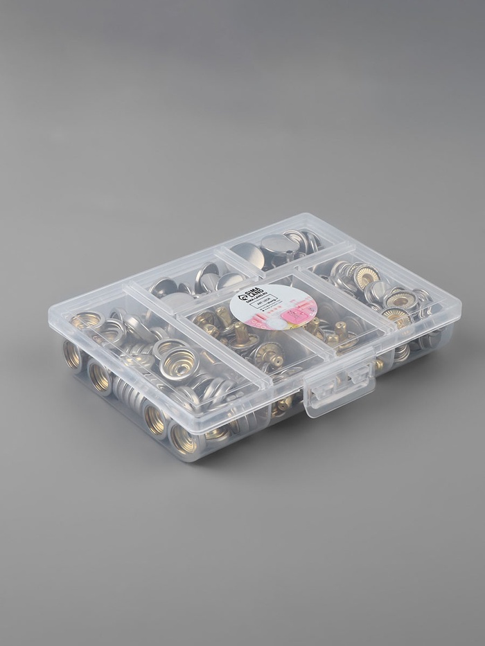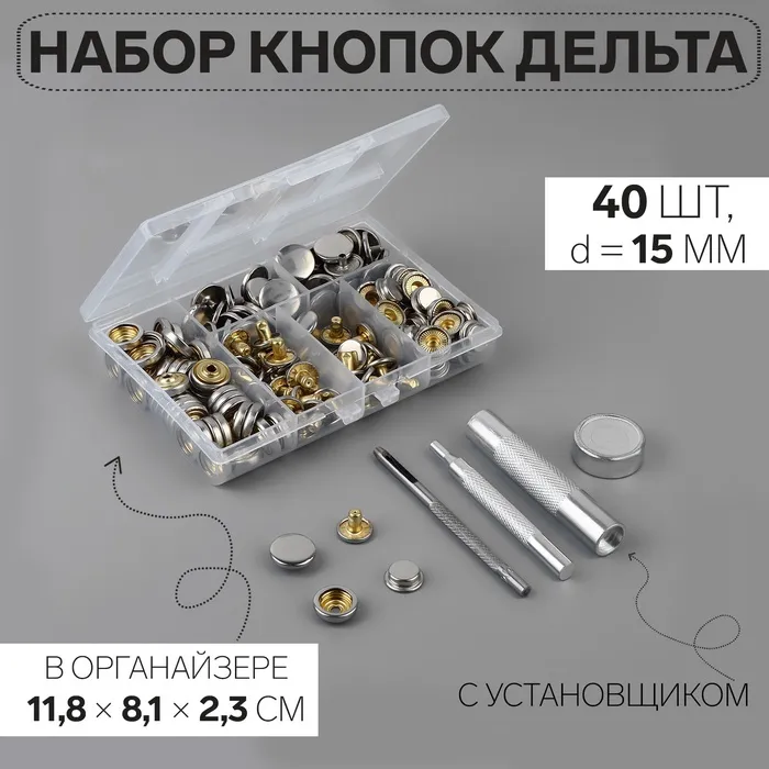В наборе: 40 кнопок, d = 15 мм, цвет серебряный; установщик; пластиковый органайзер для хранения.