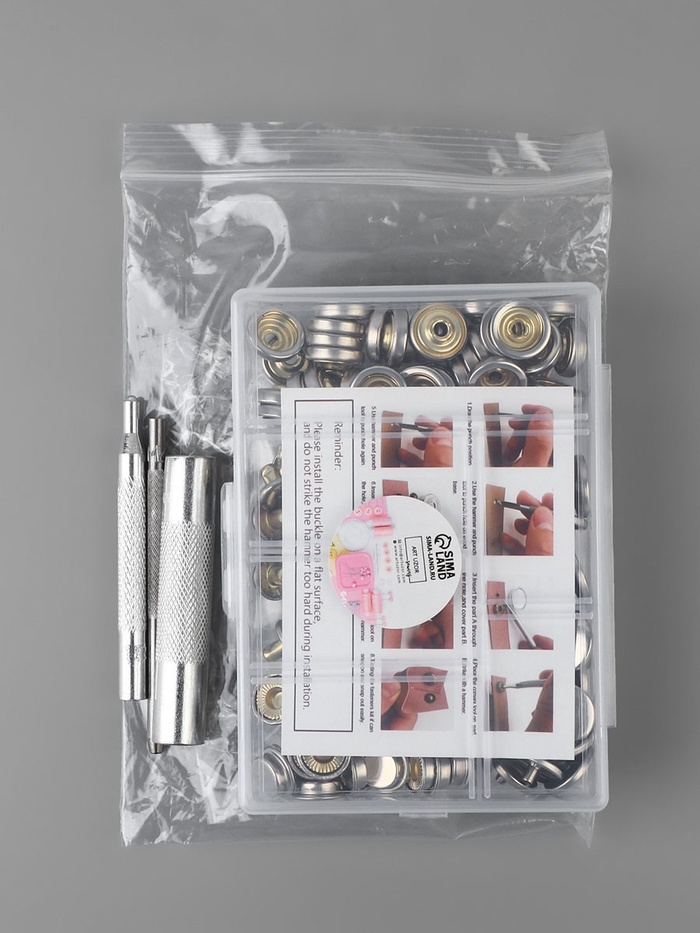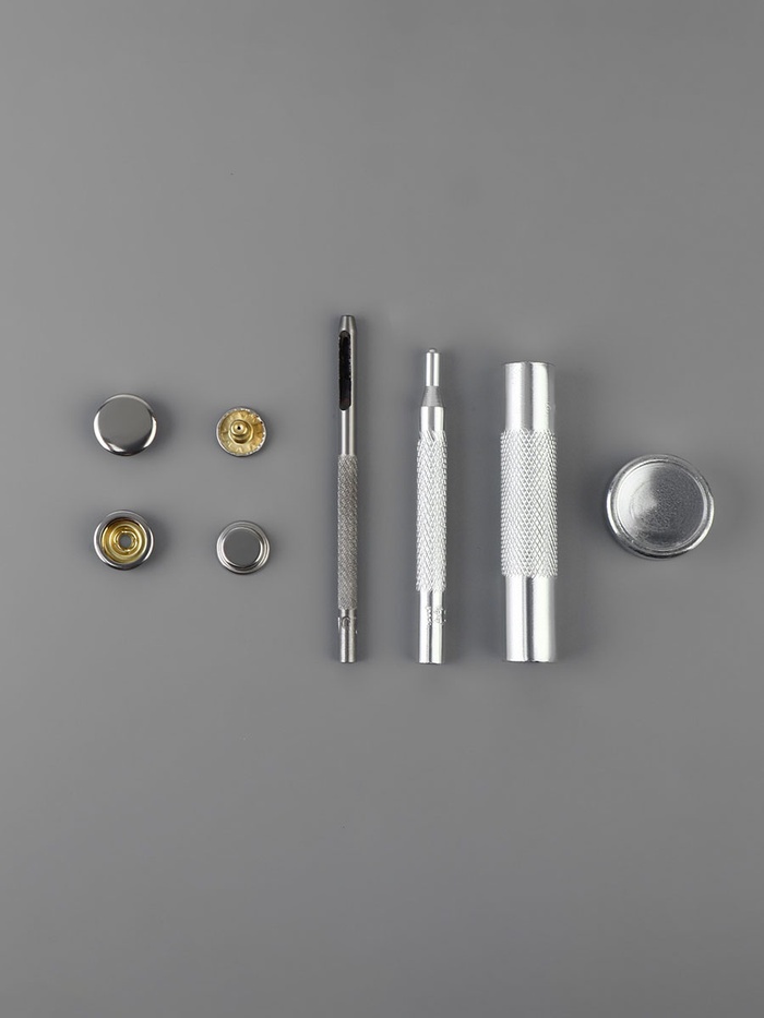 Набор O-образных кнопок с установщиком пригодится для ремонта или создания изделий из тканей средней плотности, натуральной и искусственной кожи.