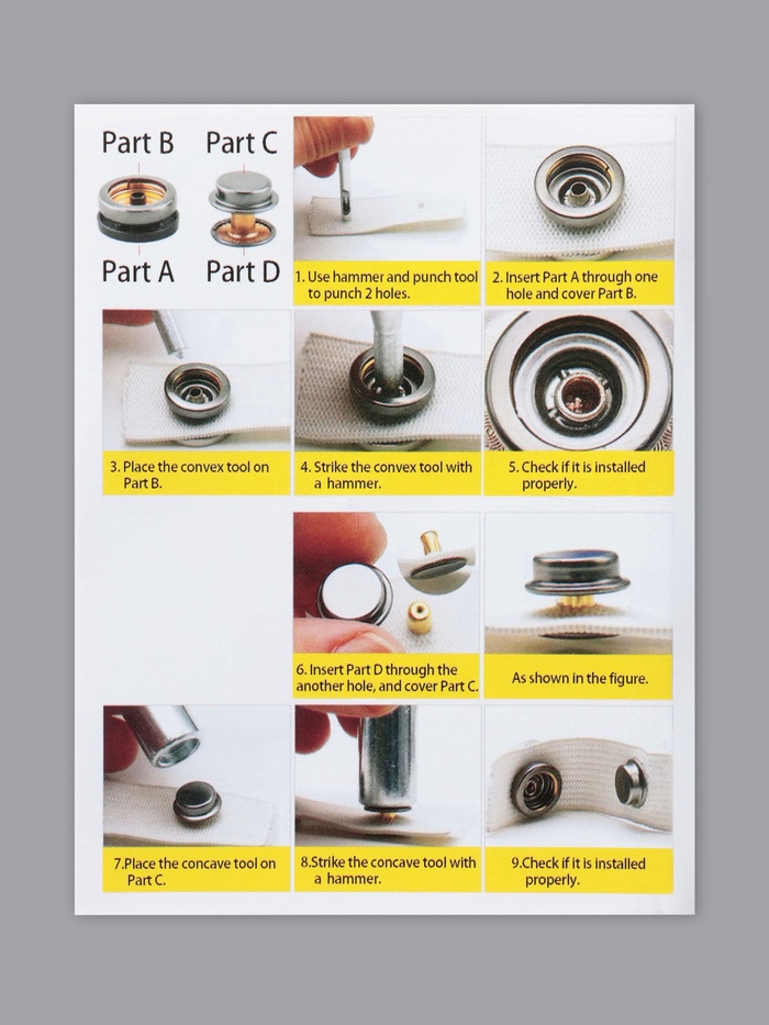 Застёжки выполнены из нержавеющей стали — они прочные и износостойкие, выдерживают воздействие солнечных лучей и перепады температур. С установщиком вы без особых усилий сможете прикрепить кнопки.