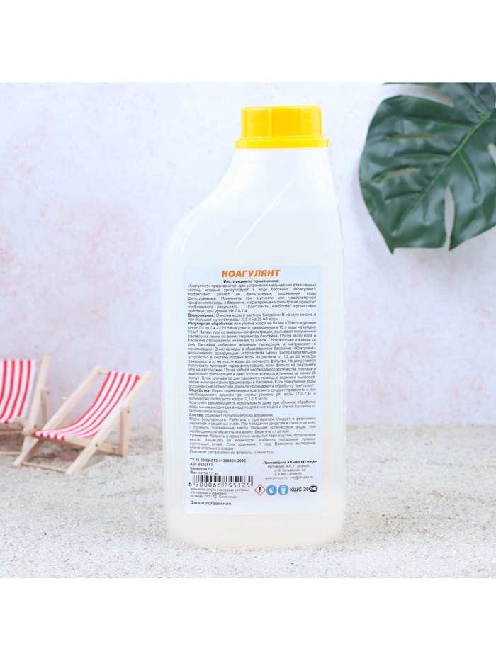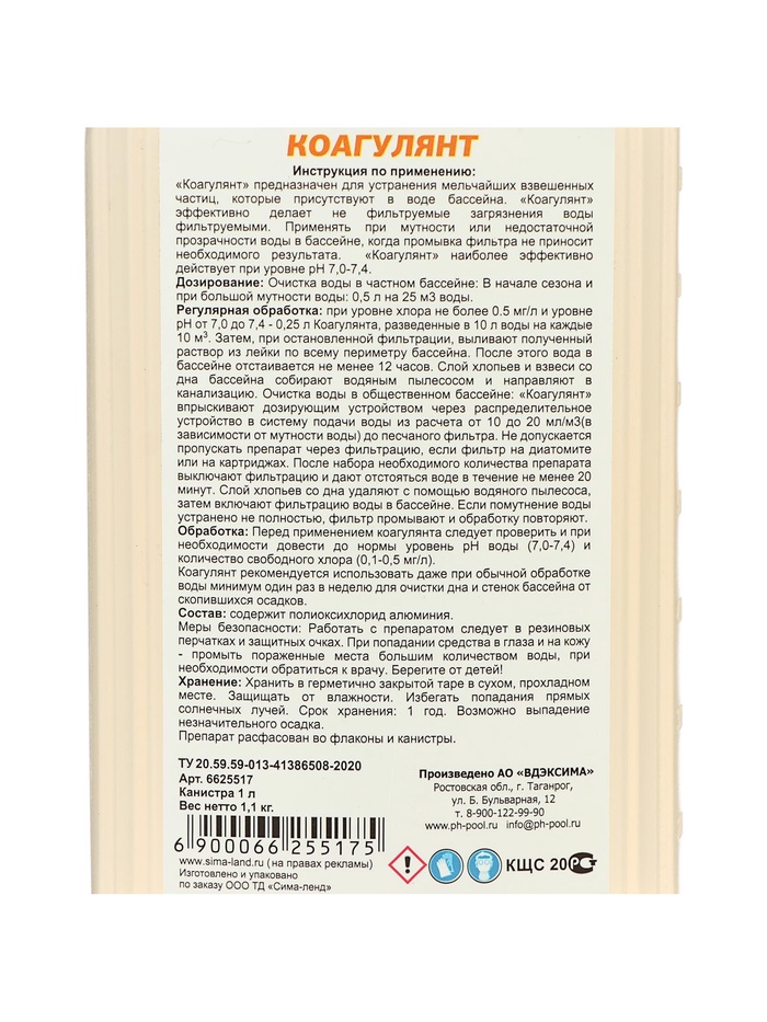 Способ применения: перед использованием коагулянта следует проверить и при необходимости довести до нормы уровень pH воды (7,0–7,4) и количество свободного хлора (0,1–0,5 мг/л). Коагулянт рекомендуется использовать даже при обычной обработке воды минимум один раз в неделю для очистки дна и стенок бассейна от скопившихся осадков.