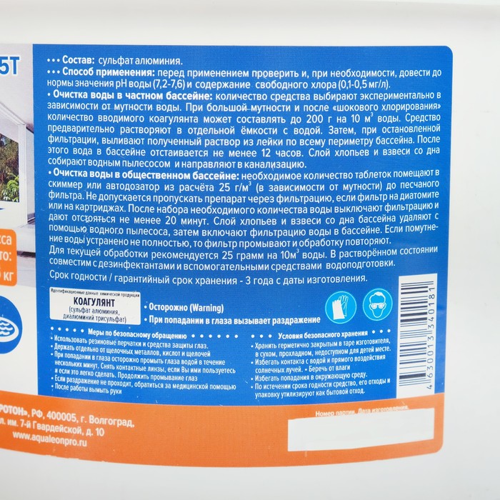 Очистка воды в частном бассейне: при большой мутности воды и после шокового хлорирования количество вводимого коагулянта может составлять до 200 г таблетированного средства на 10 м³ воды. Объём препарата выбирают экспериментально в зависимости от мутности воды и предварительно растворяют в отдельной ёмкости с водой. Затем при остановленной фильтрации выливают полученную смесь из лейки по всему периметру бассейна. После этого вода отстаивается не менее 12 часов. Слой хлопьев и взвеси со дна собирают водным пылесосом и направляют в канализацию.