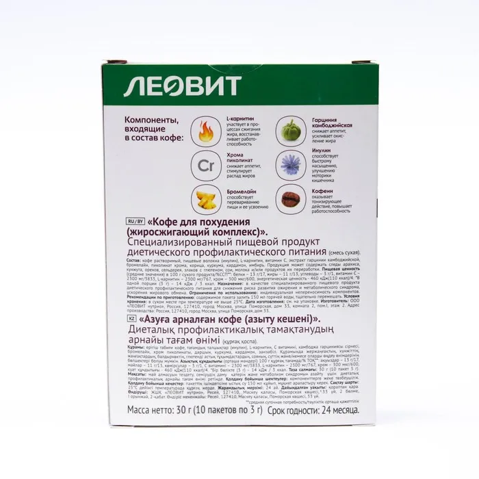 Назначение: в качестве специализированного пищевого продукта диетического профилактического питания для снижения риска развития ожирения и метаболического синдрома, ускорения жирового обмена.