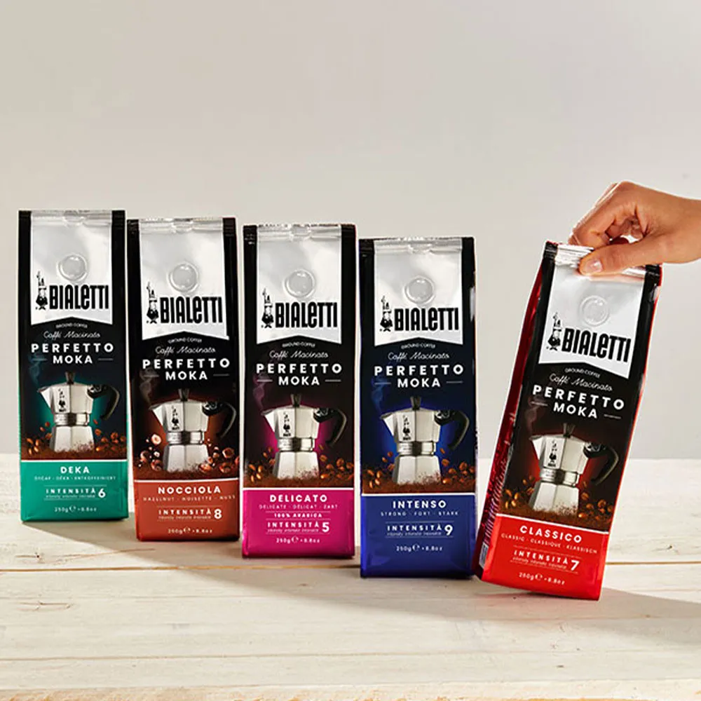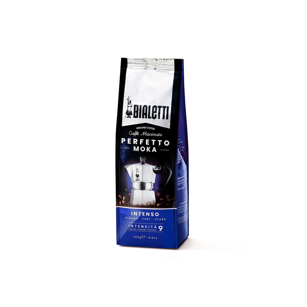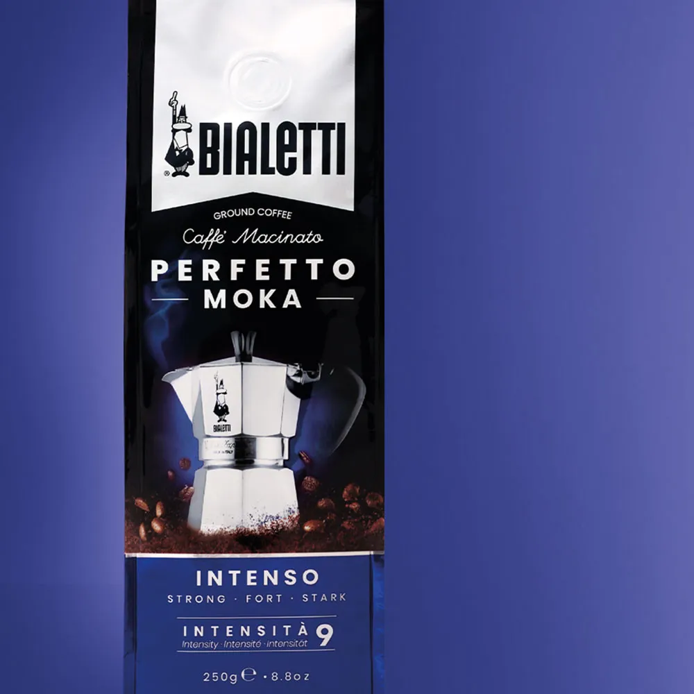 Тёмнообжаренная молотая кофейная смесь Bialetti "Perfetto Moka Intenso" создана для любителей крепкого кофе. Индийская робуста, доминирующая в смеси, придаёт ей мощный характер. В готовой чашке раскрываются нотки жареного хлеба и какао.