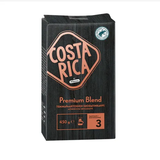 Кофе темной обжарки Pirkka Costa Rica Premium Blend - это высококачественная смесь кофейных зерен 100% арабики, выращенных в Центральной и Южной Америке. Premium Blend - сбалансированный и насыщенный. Вкус бархатистый, фруктовый, пряный и слегка дымный. Послевкусие мягкое, с приятным оттенком какао. Степень обжарки 3.