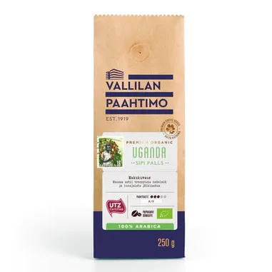 Высококачественный 100% органический кофе арабика, обжаренный в ресторане Vallila's Roastery в Хельсинки. Из зерен кофе выращенных в престижном зеленом и уникальном районе водопада Сипи в Уганде. Во вкусе ощущаются тропические фрукты и медовое послевкусие. Кофе сертифицирован UTZ. Степень обжарки 3.
