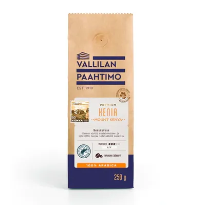 Качественный 100% кофе арабика, обжаренный на заводе Vallila в Хельсинки, выращен на высоте от 1800 до 2200 метров в горах Кения и Абердэр. Вулканическая, кислая почва и погодные условия горы Кения идеально подходят для выращивания кофе. Действительно этот кофе считается одним из лучших в мире, благодаря своему высокому качеству и нюансам. Можно отдать своё предпочтение этому кофе только лишь за мягкий полнотелый вкус черной смородины.
