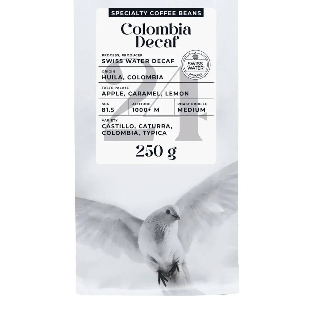 Область Хуила в Колумбии известна своими уникальными specialty-кофе. Оттуда зеленые кофейные зерна отправляются в Ванкувер, Канада, где находится штаб-квартира компании Swiss Water Decaf. Зерна обрабатываются и становятся без кофеина с помощью одной из самых передовых технологий декофеинизации в мире, названной в честь компании-разработчика.