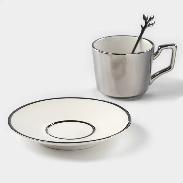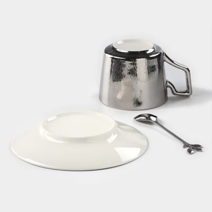 Кофейная пара «Серебро», 3 предмета: чашка 200 мл, блюдце d=14 см, ложка h=12.5 см, керамика, серебристая — Характеристики