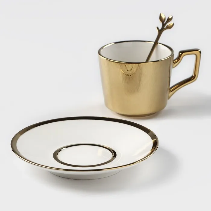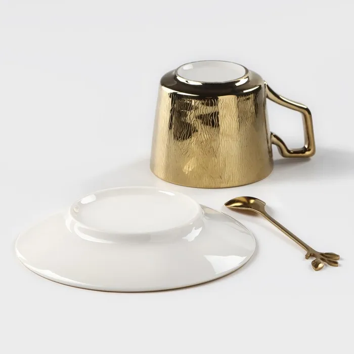 Кофейная пара «Золото», 3 предмета: чашка 200 мл, блюдце d=14 см, ложка h=12.5 см, керамика, золотистая — Характеристики