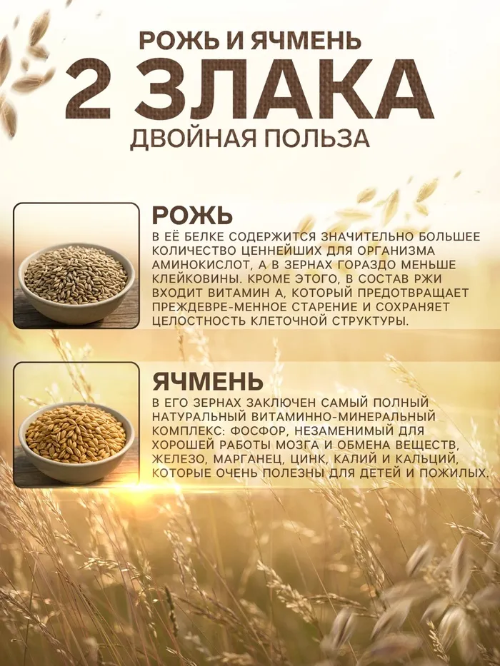 Состав напитка основывается на тщательно отобранных ингредиентах: в нем нет искусственных добавок и консервантов, так что вы можете наслаждаться своим любимым кофе без лишних забот. Ячмень -второй кофезаменитель после цикория. В напитках из ячменя большое содержание витаминов группы В, а также С, Е и К, а из микро- и макроэлементов - калий, фосфор, магний, натрий, селен, железо, цинк и др. Элементы злака способствуют снятию воспалений слизистой желудка, облегчают протекание болезней почек. В их составе присутствуют углеводы, белки и клетчатка, а также фосфор и кальций."