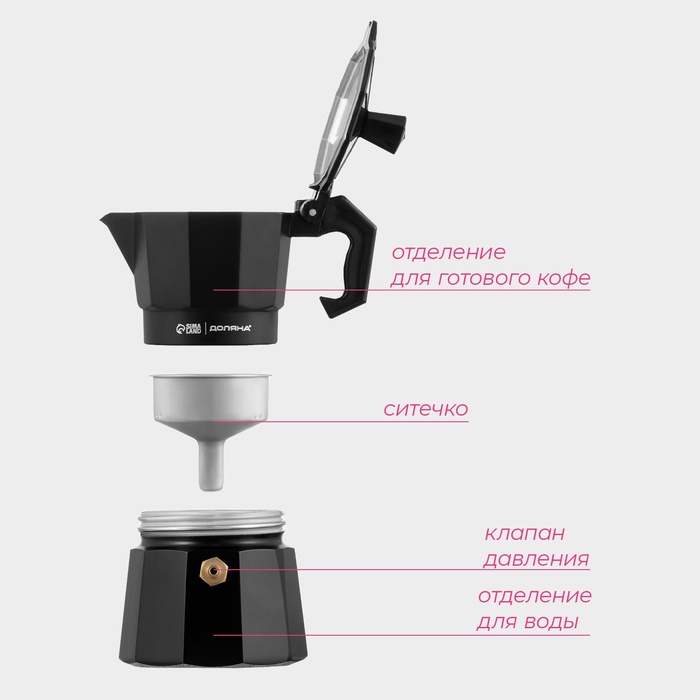 Кофеварка гейзерная Доляна Alum black, на 1 чашку, 50 мл, алюминий, чёрная — Характеристики