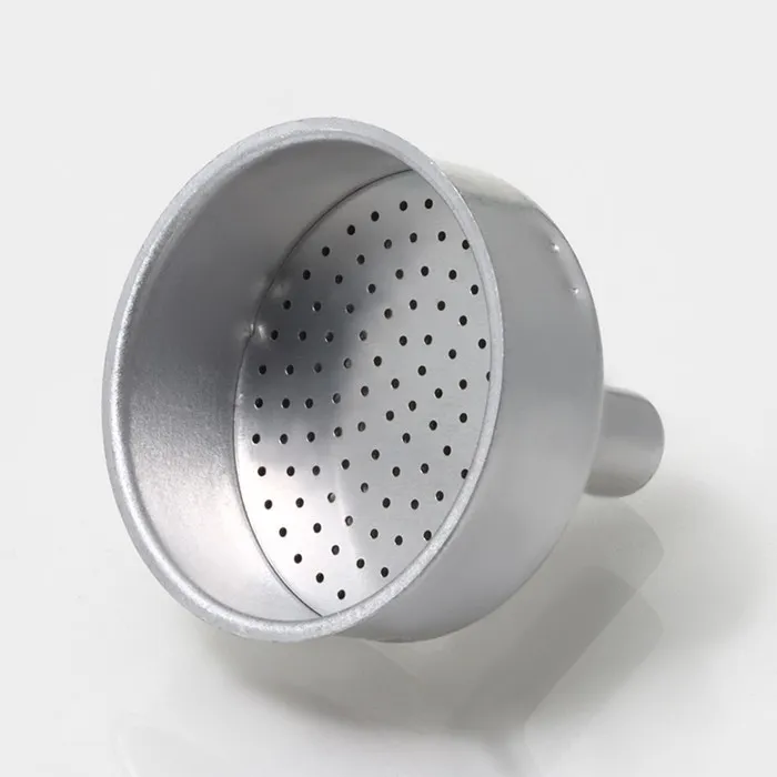 - Вставьте воронку в нижний резервуар, уберите излишки кофе с бортиков, чтобы они не прилипли к уплотнителю, и крепко прикрутите верхнюю часть на место.