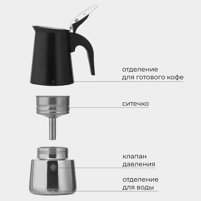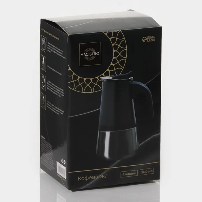 Кофеварка гейзерная Magistro Classic black, на 4 чашки, 200 мл, индукция, нержавеющая сталь, чёрная — Характеристики