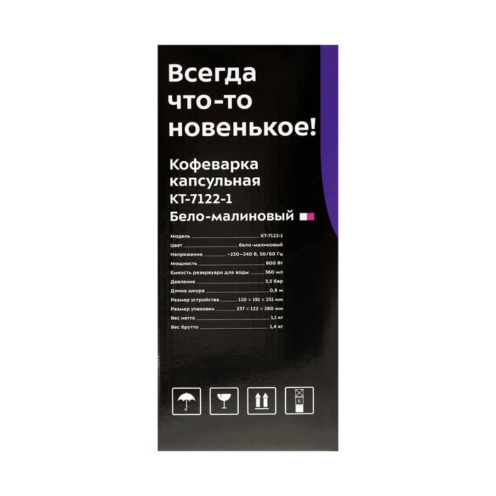 Кофеварка Kitfort KT-7122-1, капсульная, 800 Вт, 0.36 л, бело-розовая — Характеристики