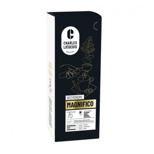 Magnifico — один из самых популярных сортов кофе Шарля Льежуа. В его вкусе преобладают нотки темного шоколада, дерева и обжаренных зерен. Аромат сильный, а сам кофе естественно сладкий. Длительное послевкусие шоколада остается на языке даже после последнего глотка. Этот кофе обязательно понравится любителям традиционного вкуса кофе.