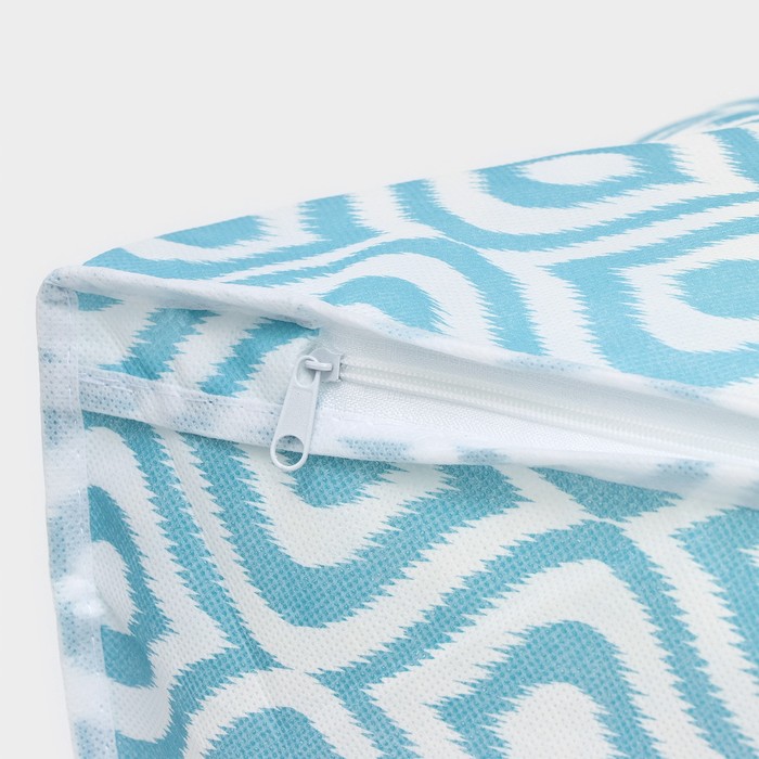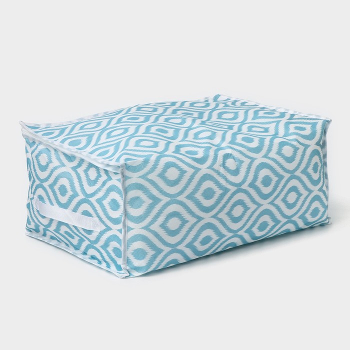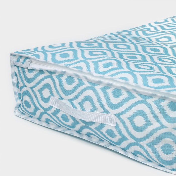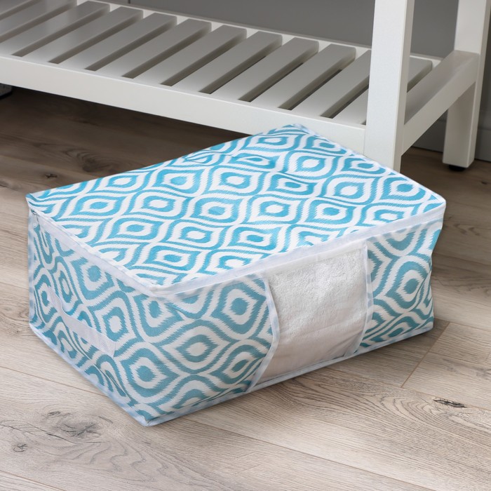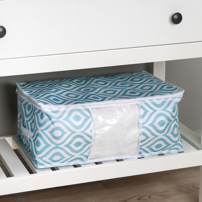Изготовленный из качественного флизелина, кофр привлекает внимание своим ярким бирюзовым цветом и оригинальными узорами, которые добавят нотку свежести в интерьер. Прозрачное ПВХ-окно позволяет легко увидеть содержимое, что исключает необходимость в постоянных поисках нужных вещей.