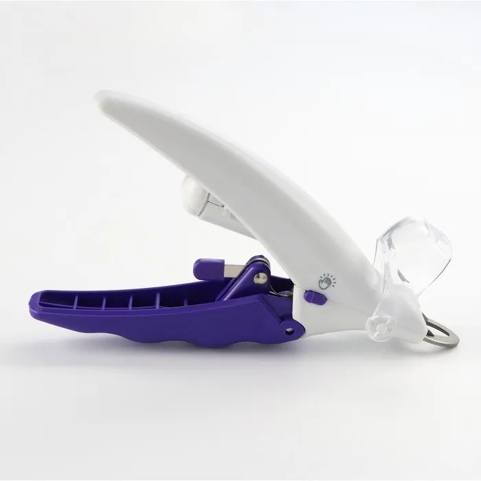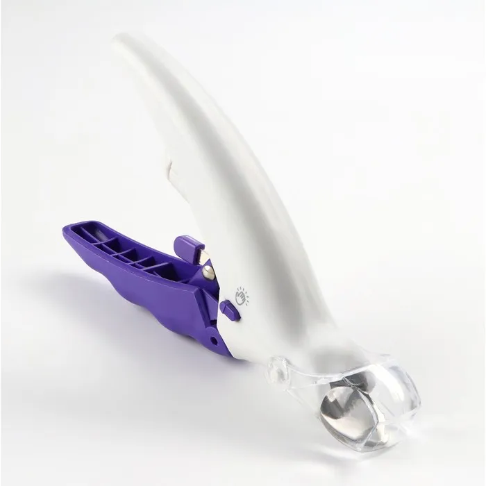 Когтерез для животных, с LED фонарём и контейнером для когтей, на батарейках, бело-фиолет.
