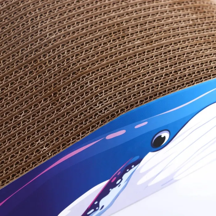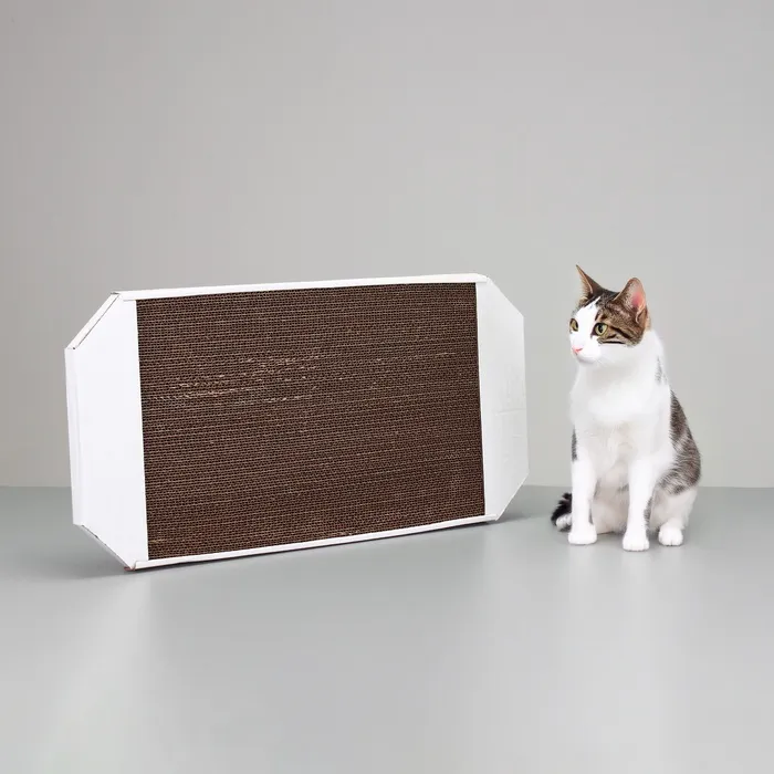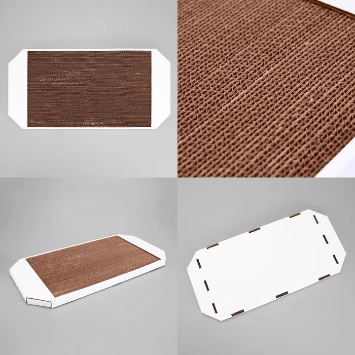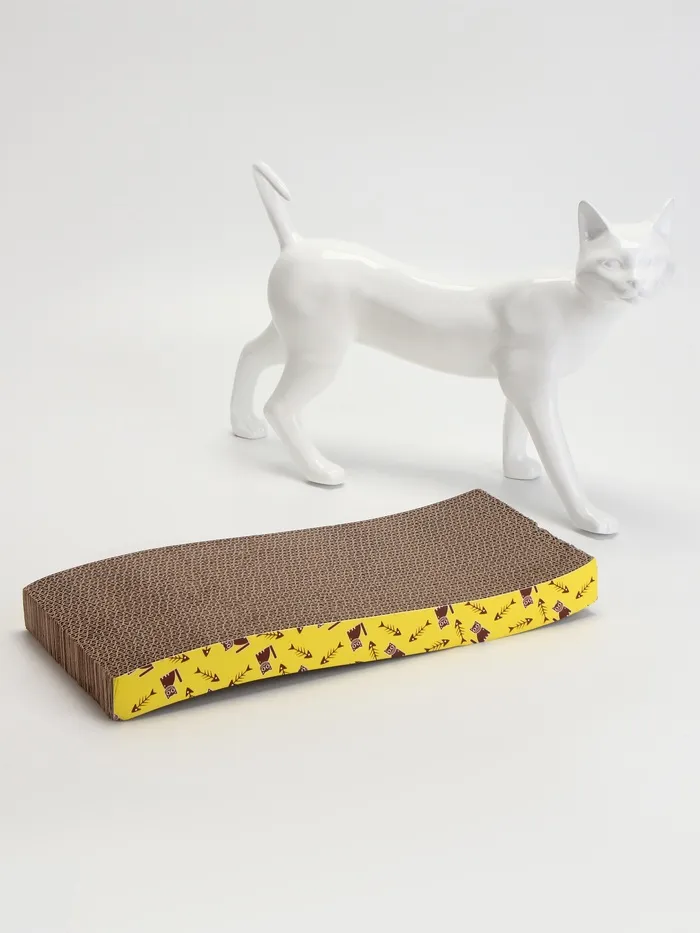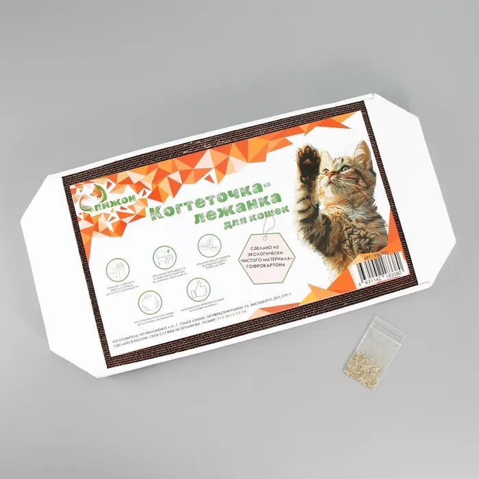 Он выполнен из гофрокартона, который изготовлен из природного материала - древесины и по своим свойствам очень на нее похож, чем и привлекают наших питомцев. Он достаточно плотен, чтобы выдержат острые коготки, и оптимально податлив, чтобы привлекать кошку.