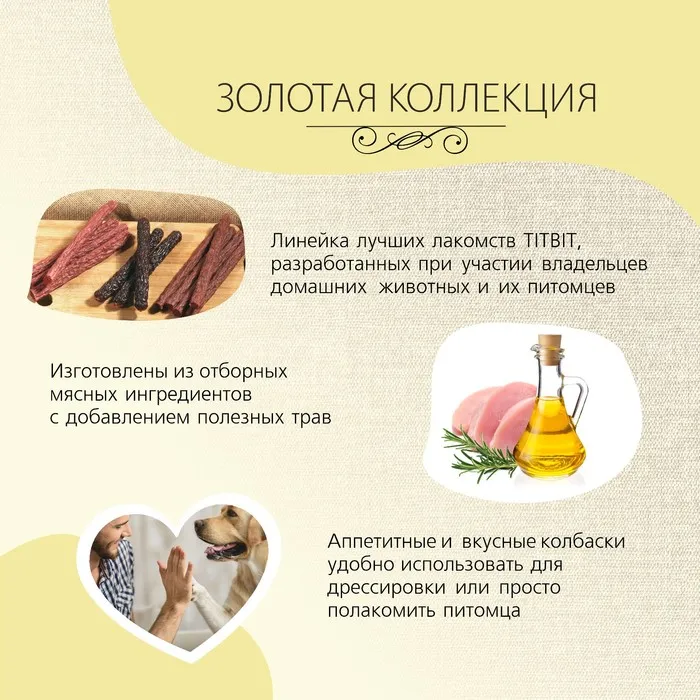 Золотая коллекция – это линейка лучших лакомств TITBIT, разработанных при участии владельцев домашних животных и их питомцев. Колбаса «Пармская» приготовлена из говядины и филе курицы и дополнена щепоткой мускатного ореха, придающего изысканность нежному вкусу.