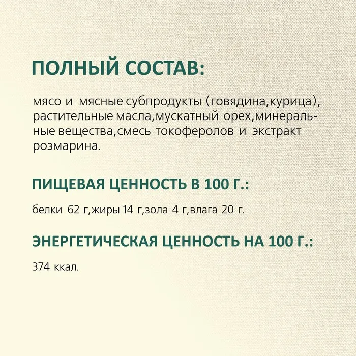 Состав:мясо и мясные субпродукты (говядина 52%, курица 40%), растительные масла, мускатный орех, минеральные вещества, смесь токоферолов и экстракт розмарина.