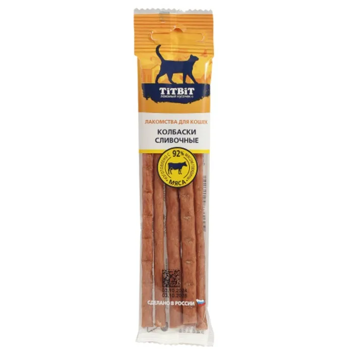 Лакомства Золотая коллекция TiTBiT– это линейка мясных лакомств, разработанных при участии владельцев домашних животных и их питомцев. Колбаски «Сливочные» приготовлены из отборной говядины и дополнены сливками, которые придают изысканность вкусу лакомства. Эти колбаски станут прекрасным угощением для вашего питомца.