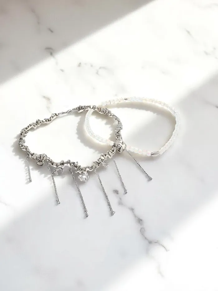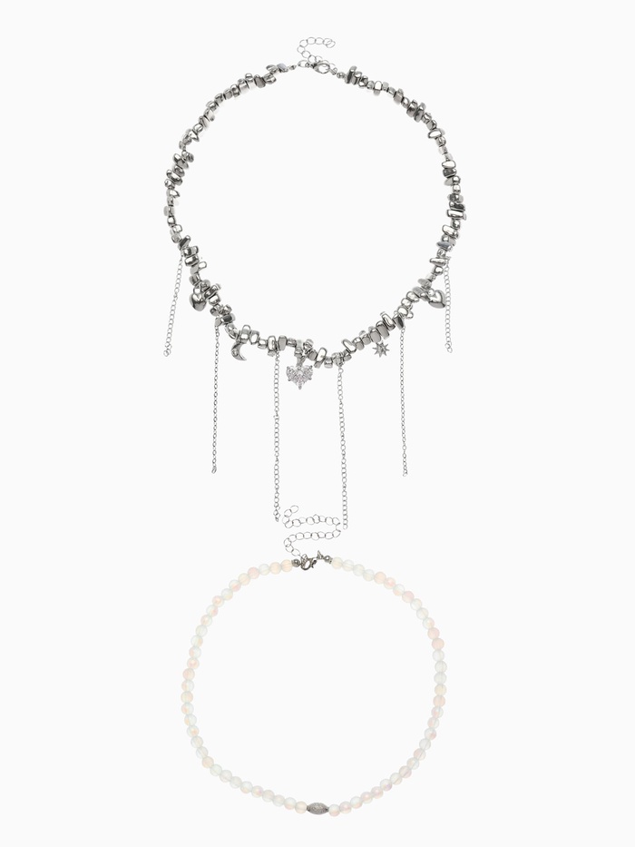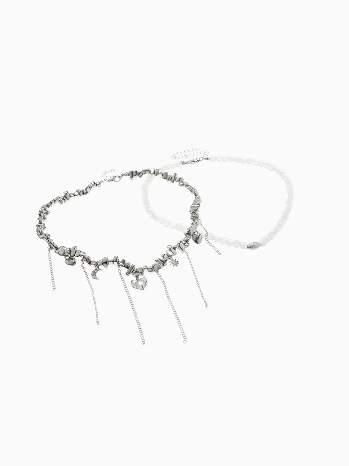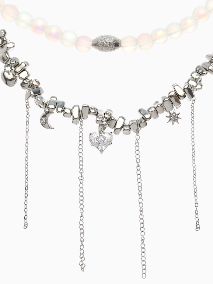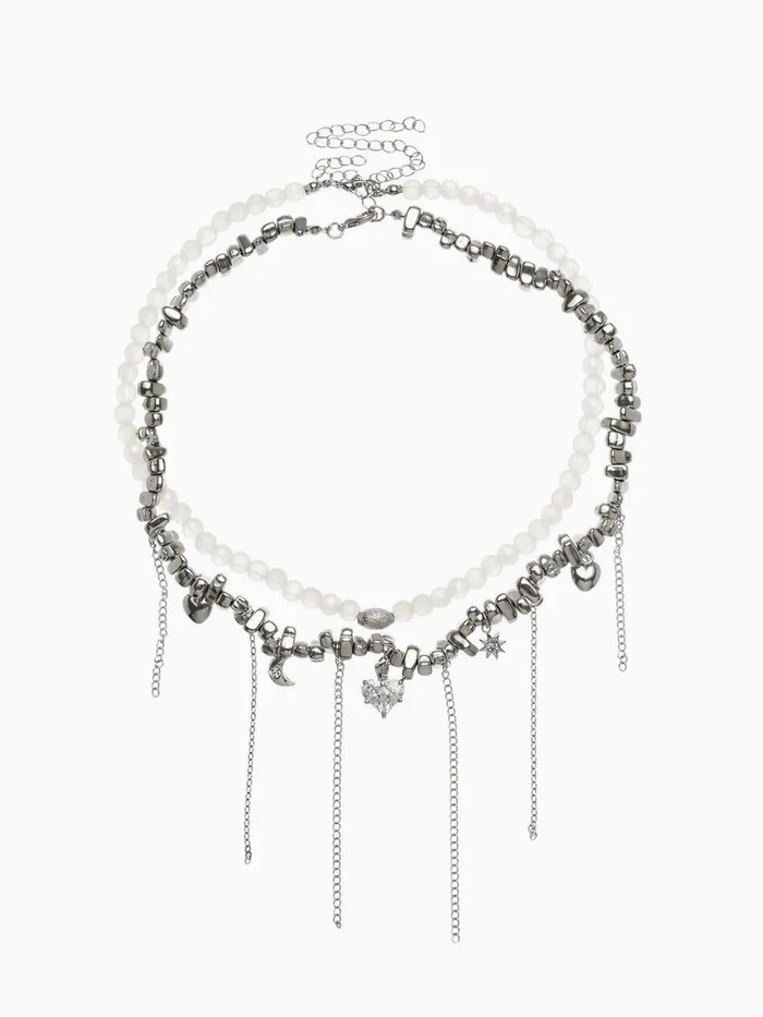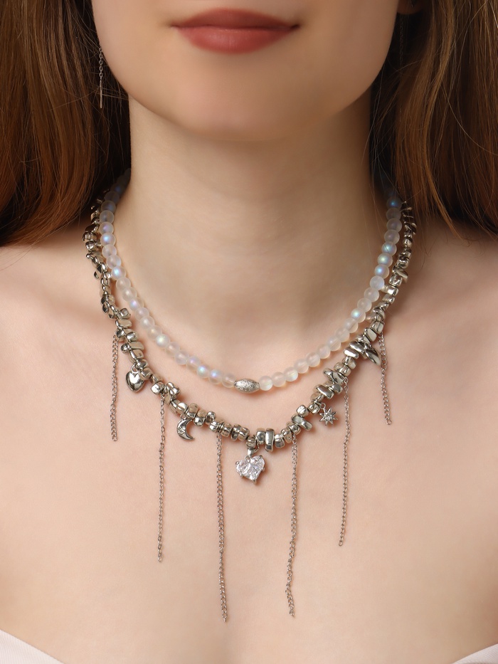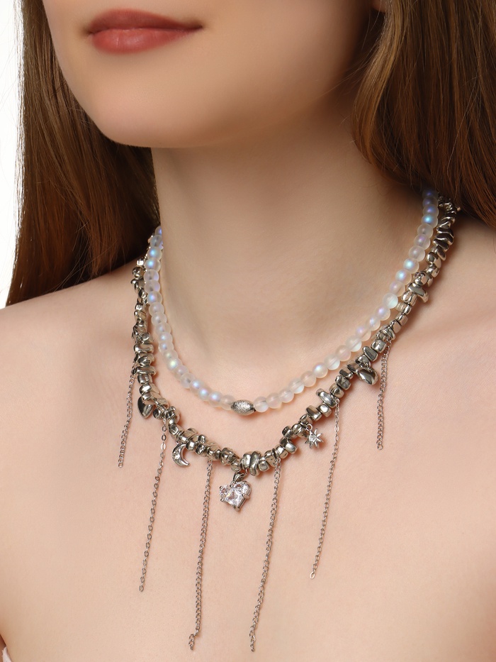 Двойное колье с изящными подвесками в форме сердца и луны сочетает в себе глубокий серый оттенок с серебристой фурнитурой, создавая гармоничный и современный аксессуар для женщин, ценящих стиль и оригинальность. Материал из пластика в сочетании с металлическими вставками обеспечивает лёгкость и комфорт при ношении, а длина 32 см идеально подчёркивает линию шеи, делая украшение универсальным для различных образов.
