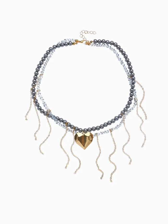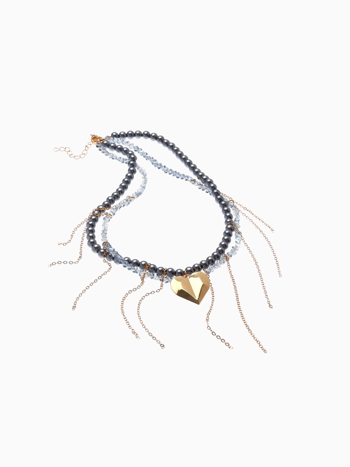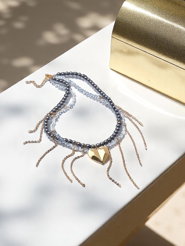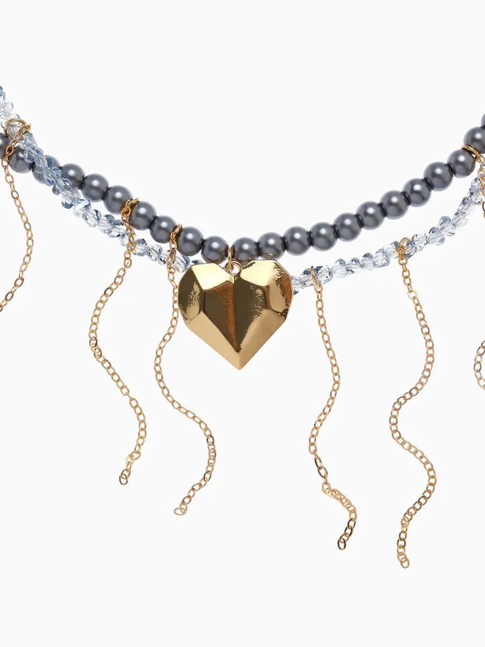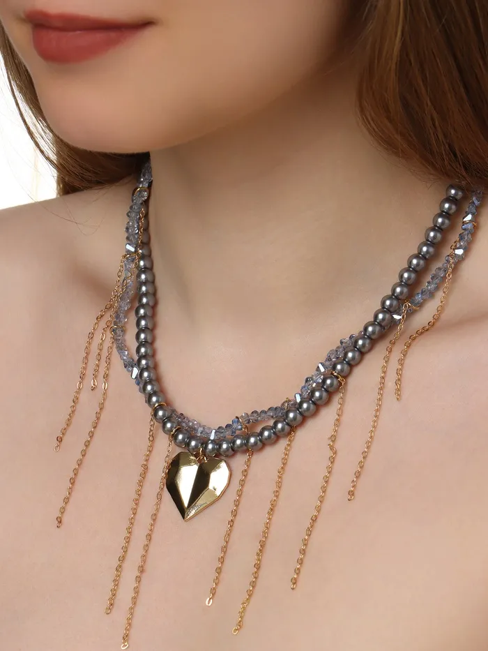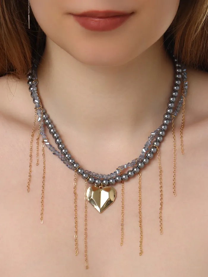 Многослойное колье с крупным сердцем в серо-золотой гамме — это гармоничное сочетание современного дизайна и изящной элегантности. Длина 32 см позволяет эффектно подчеркнуть зону декольте, делая образ завершённым и выразительным.