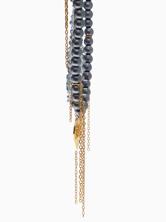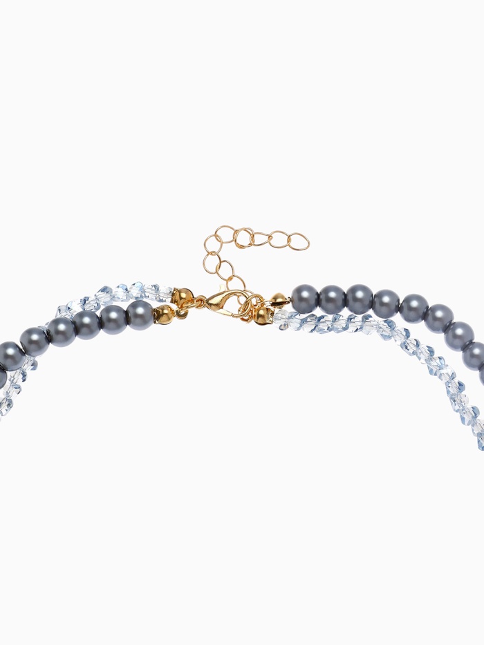 Изделие выполнено из лёгкого пластика с металлическими вставками золотого цвета, что обеспечивает комфорт при ношении и придаёт украшению благородный блеск. Многослойная структура добавляет объёма и глубины, создавая эффектное визуальное восприятие, а сдержанная цветовая палитра делает колье универсальным аксессуаром для разных стилей и событий.