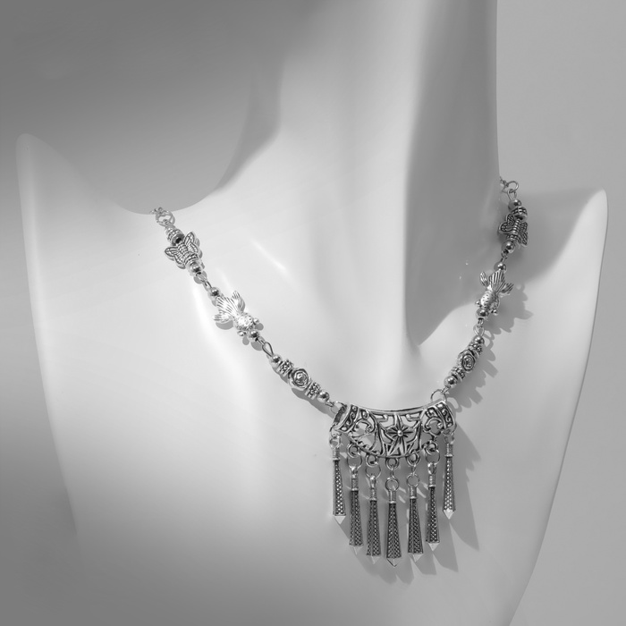 Элегантное колье длиной 32 см, выполненное из металла с эффектом чернёного серебра, воплощает в себе дух восточной эстетики и изысканности. Одноярусное украшение украшено изящными цветочными мотивами и нежной подвеской в виде бабочки, которые придают образу лёгкость и загадочность.