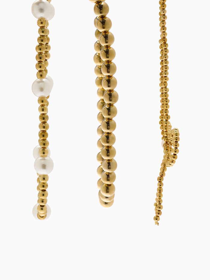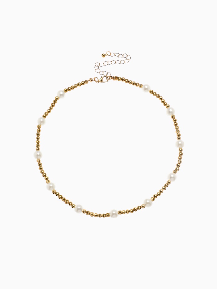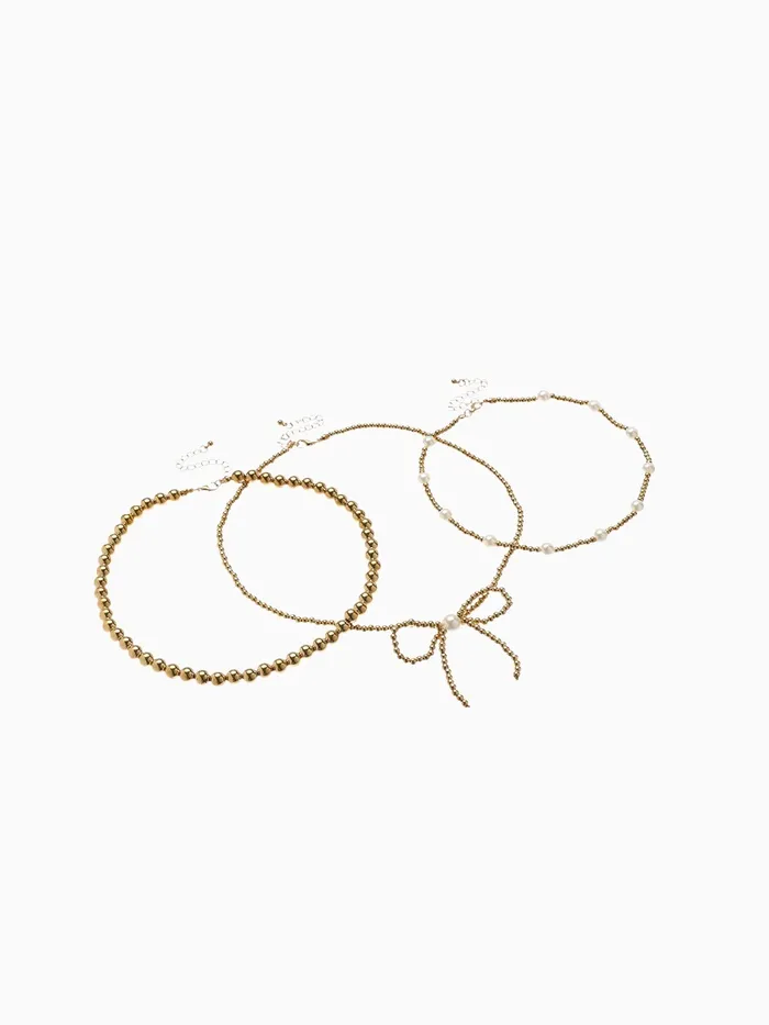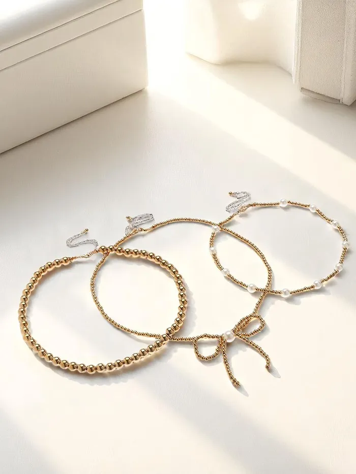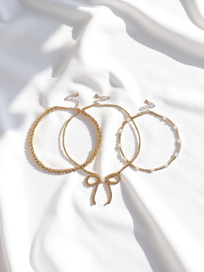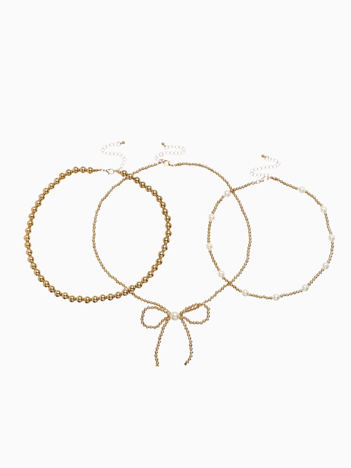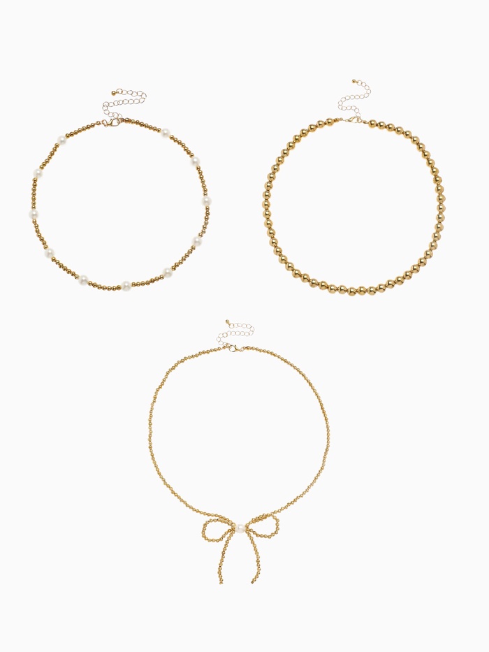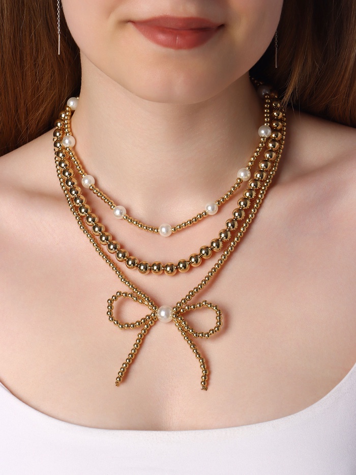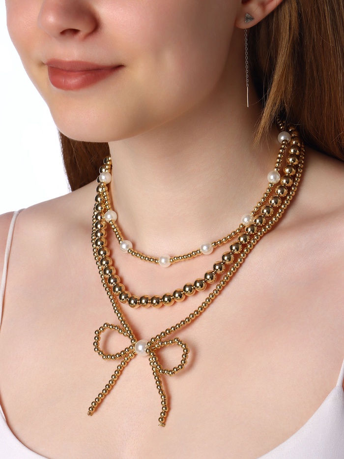 Эффектное колье длиной 32 см с многослойным дизайном и изящным бантиком в нежном белом оттенке на фоне золотистой фурнитуры — воплощение лёгкости и женственности. Использование пластика в качестве основного материала делает украшение лёгким и комфортным для ежедневного ношения, при этом оно сохраняет изысканный внешний вид и современную эстетику.