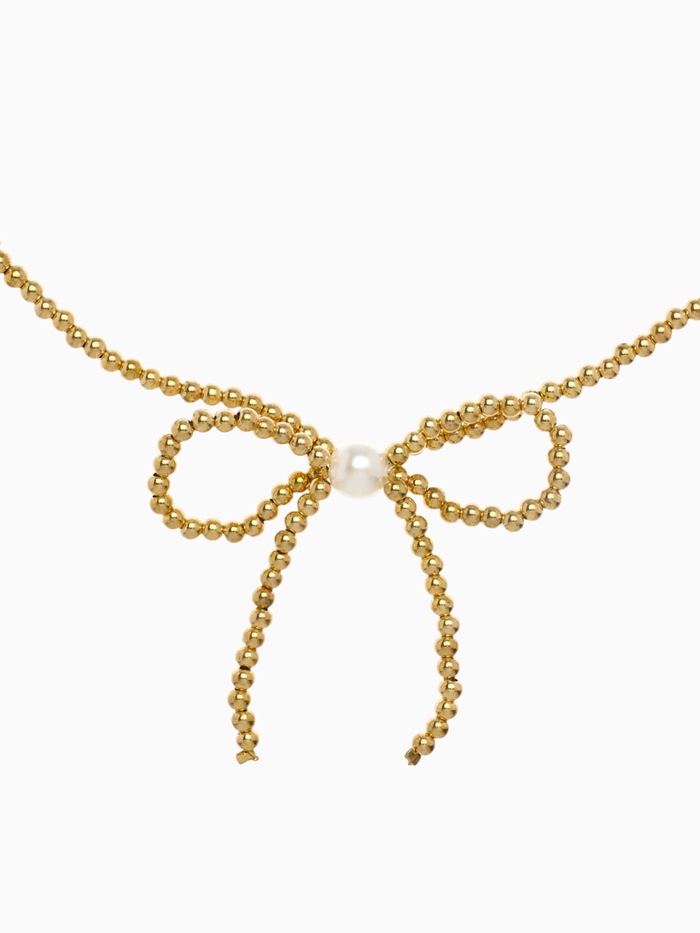 Отсутствие вставок подчёркивает минимализм и чистоту линий, позволяя акцентировать внимание на изящной форме бантика и благородном золотистом блеске металлических элементов. Такое колье станет универсальным дополнением к любому образу, от делового до вечернего, подчёркивая индивидуальность и тонкий вкус своей хозяйки.