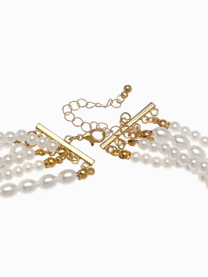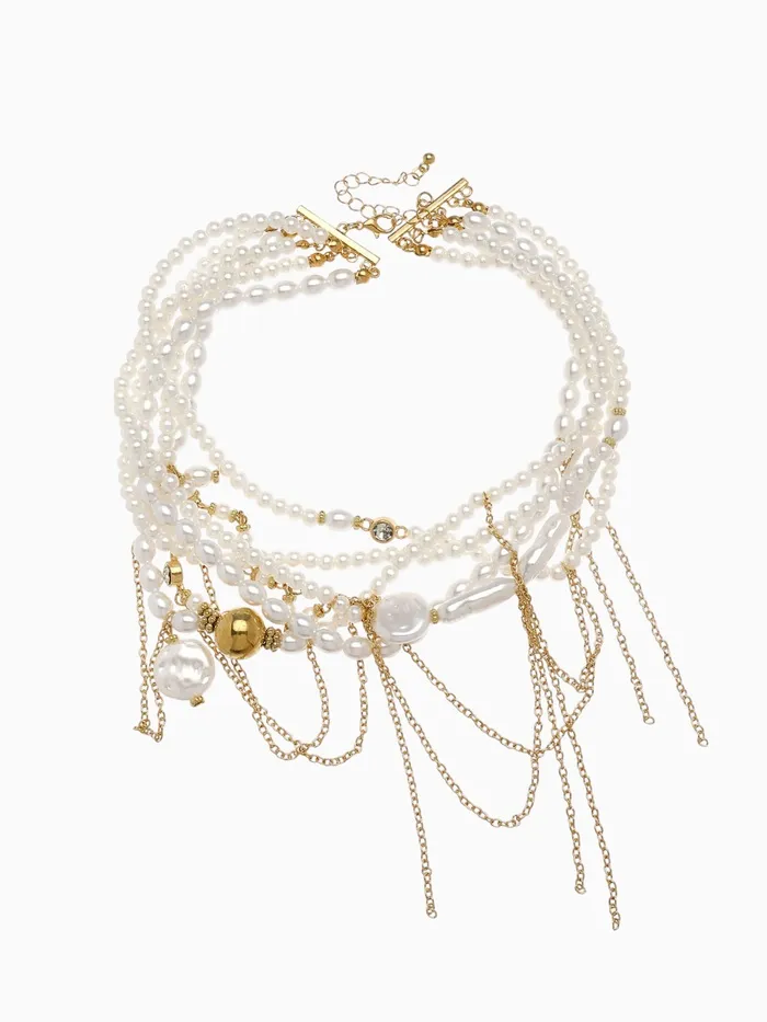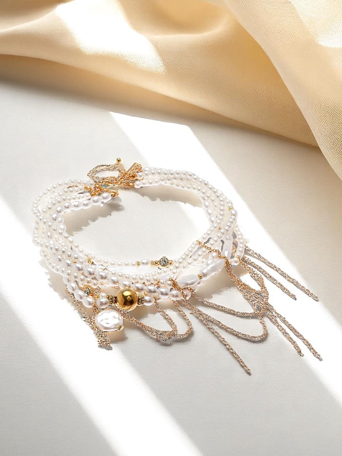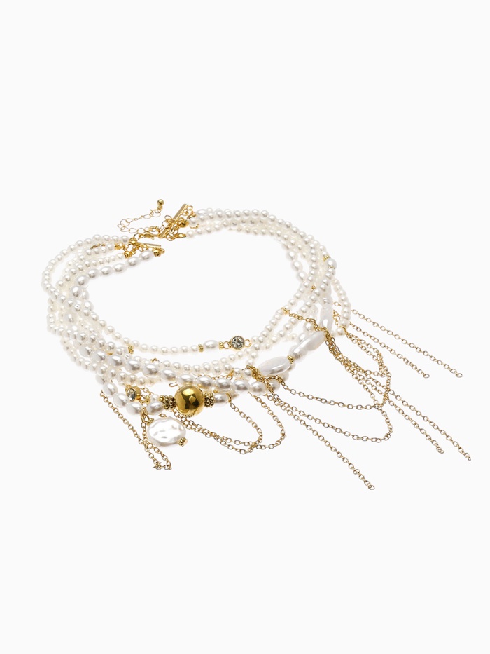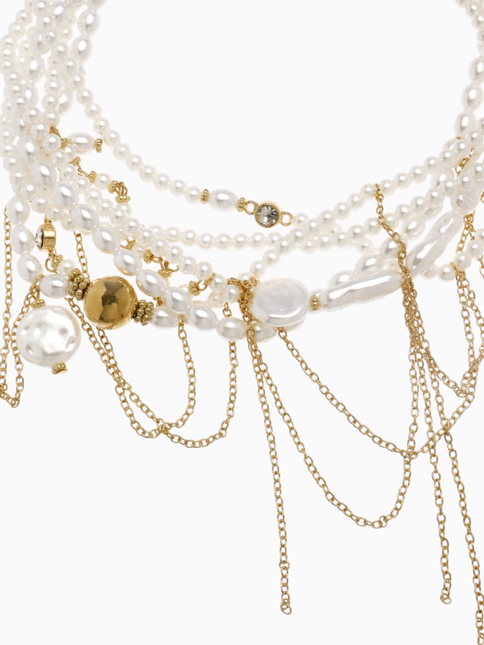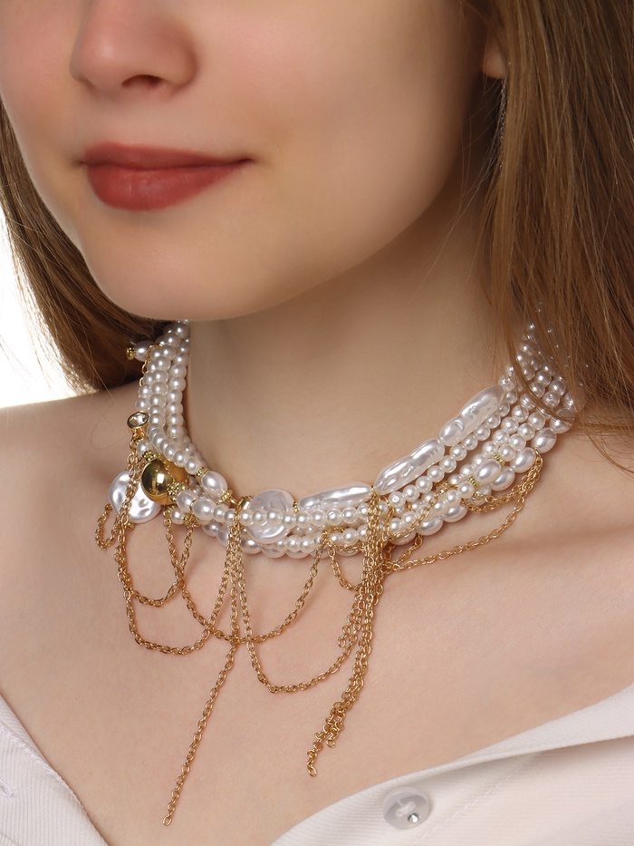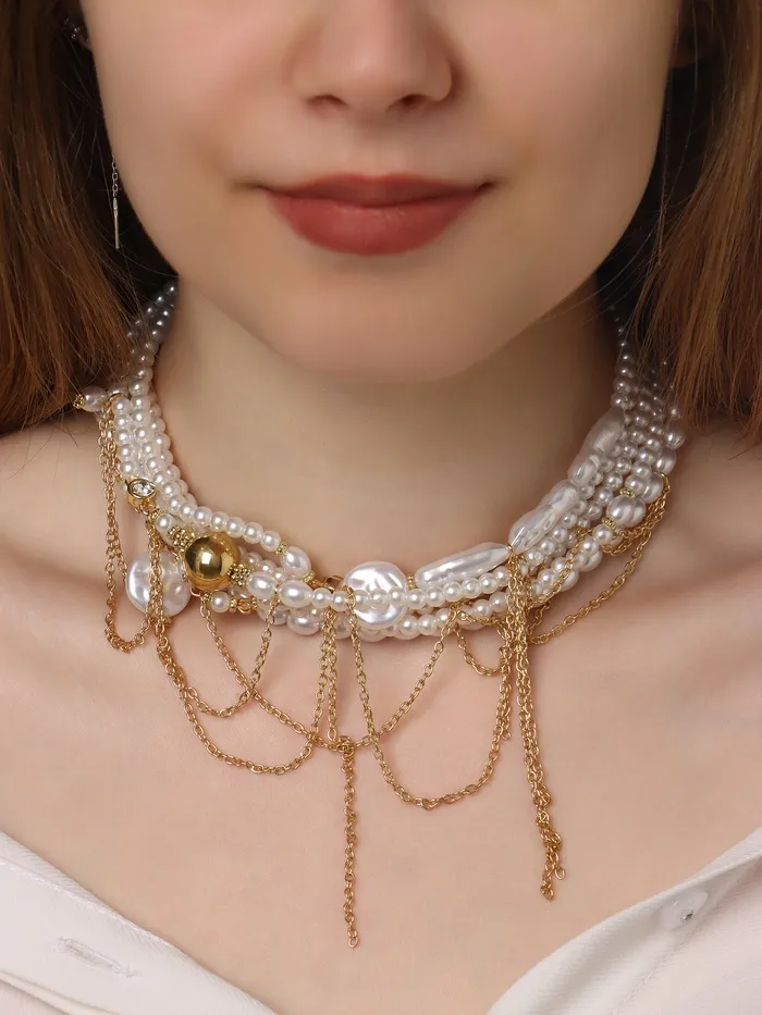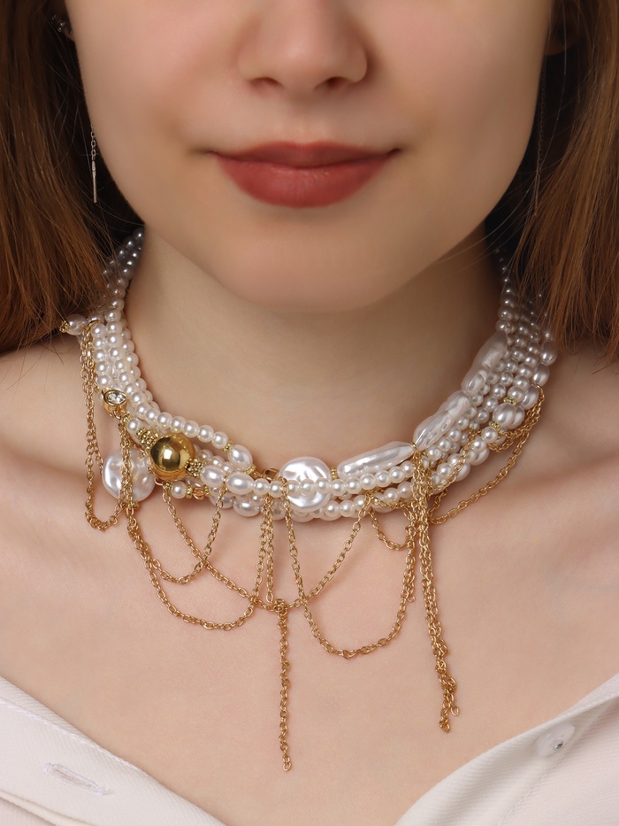 Это колье — идеальный выбор для тех, кто стремится подчеркнуть свою индивидуальность и создать гармоничный, запоминающийся образ с лёгким жемчужным сиянием и золотистым блеском.