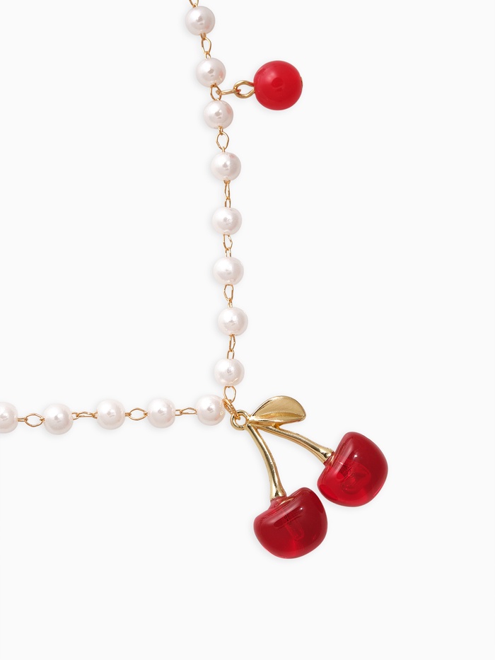 Эффектное колье на жемчужной дорожке с объёмной подвеской в виде яркой вишни — это украшение, которое гармонично сочетает в себе классическую элегантность и современную игривость. Белоснежные бусины диаметром 6 мм на пластиковой основе создают лёгкий и воздушный образ, а золотистая фурнитура подчёркивает изысканность изделия.