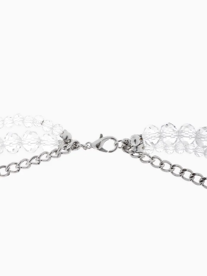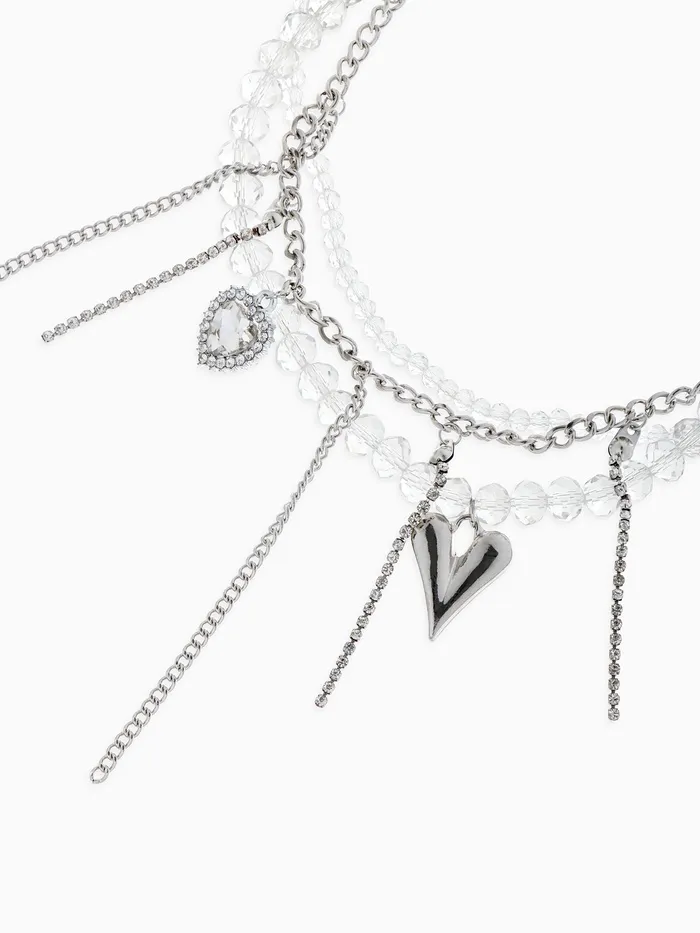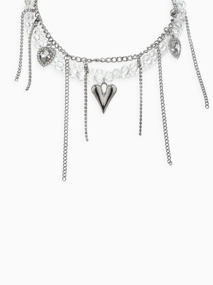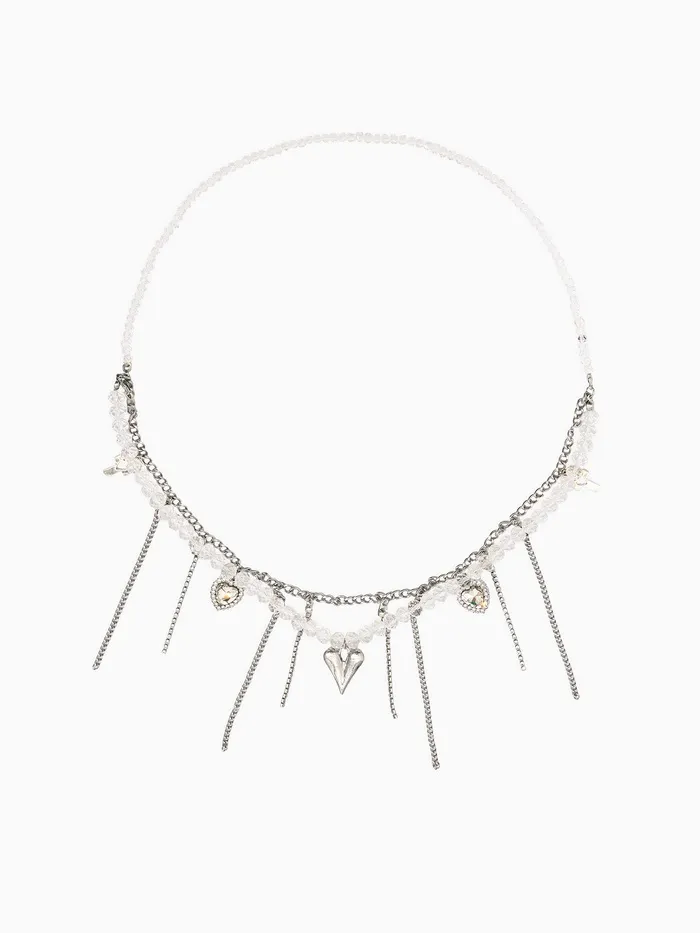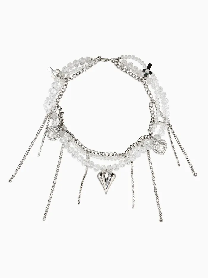 Колье длиной 30 см сочетает в себе утончённость серебристого металла и прозрачную лёгкость стеклянных вставок, создавая впечатление воздушности и изысканной чистоты. Переплетённые элементы подчёркивают сложность и глубину дизайна, а подвески в форме сердца добавляют романтичную символику, раскрывая особую теплоту и женственность.